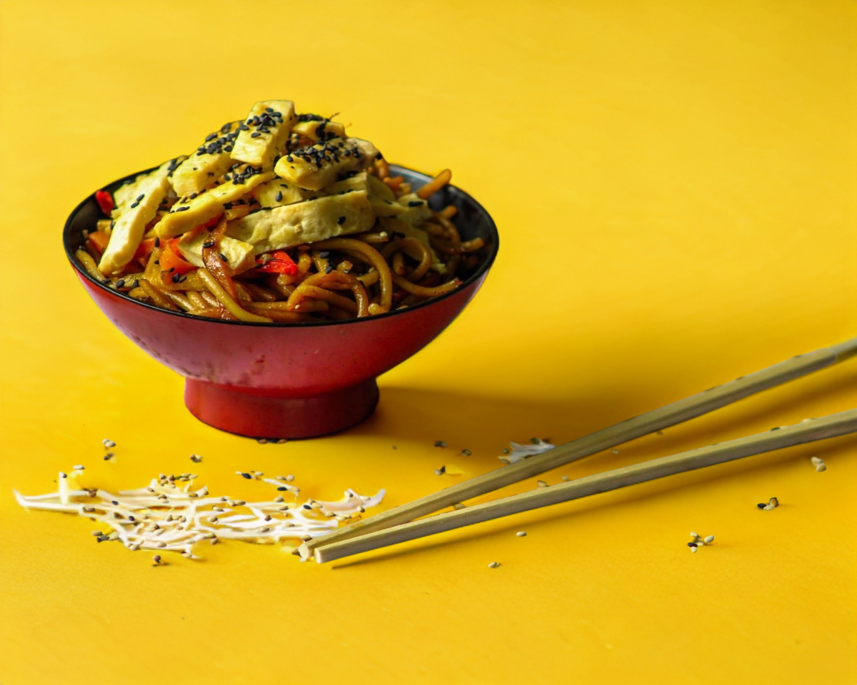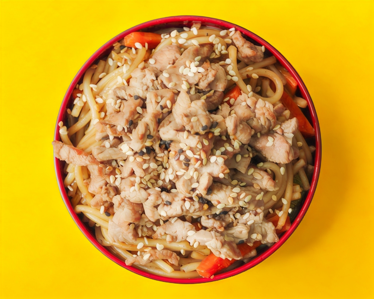 Fideo de arroz con verduras al vapor y tiritas de pechuga de pollo marinadas y asadas.