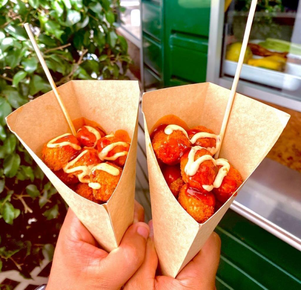 Cono de palomitas de Pollo y mini kushiage de queso . Incluye 2 salsas a elegir