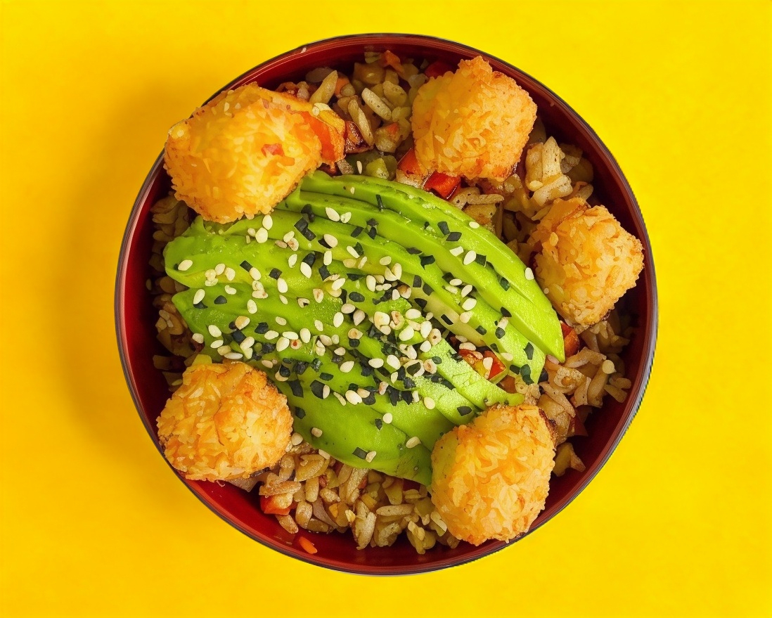 Arroz Gohan frito marinado con soya , aguacate y salseado con dip de chipotle