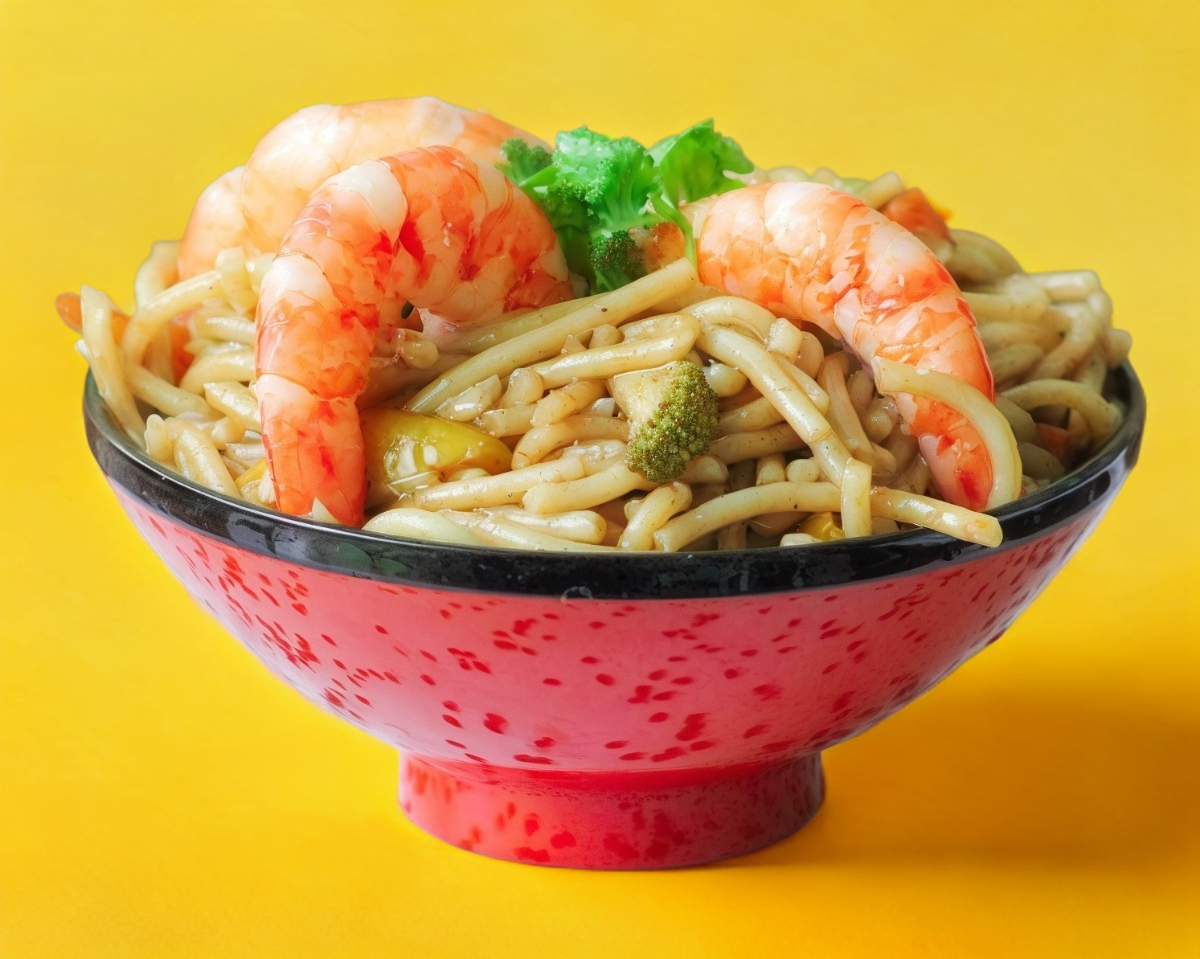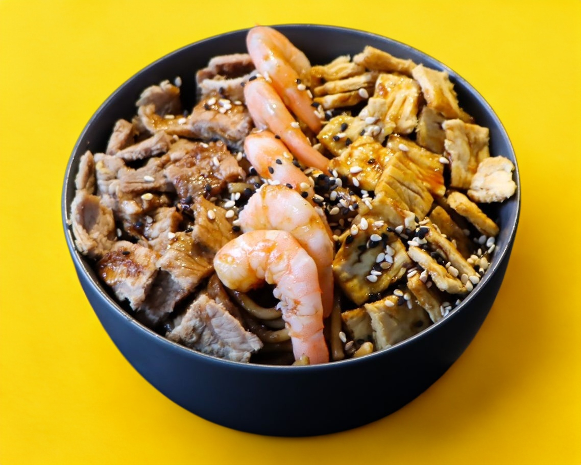 Fideos con verduras al vapor , acompanado de camaron , pollo y carne marinados y sazonados.
