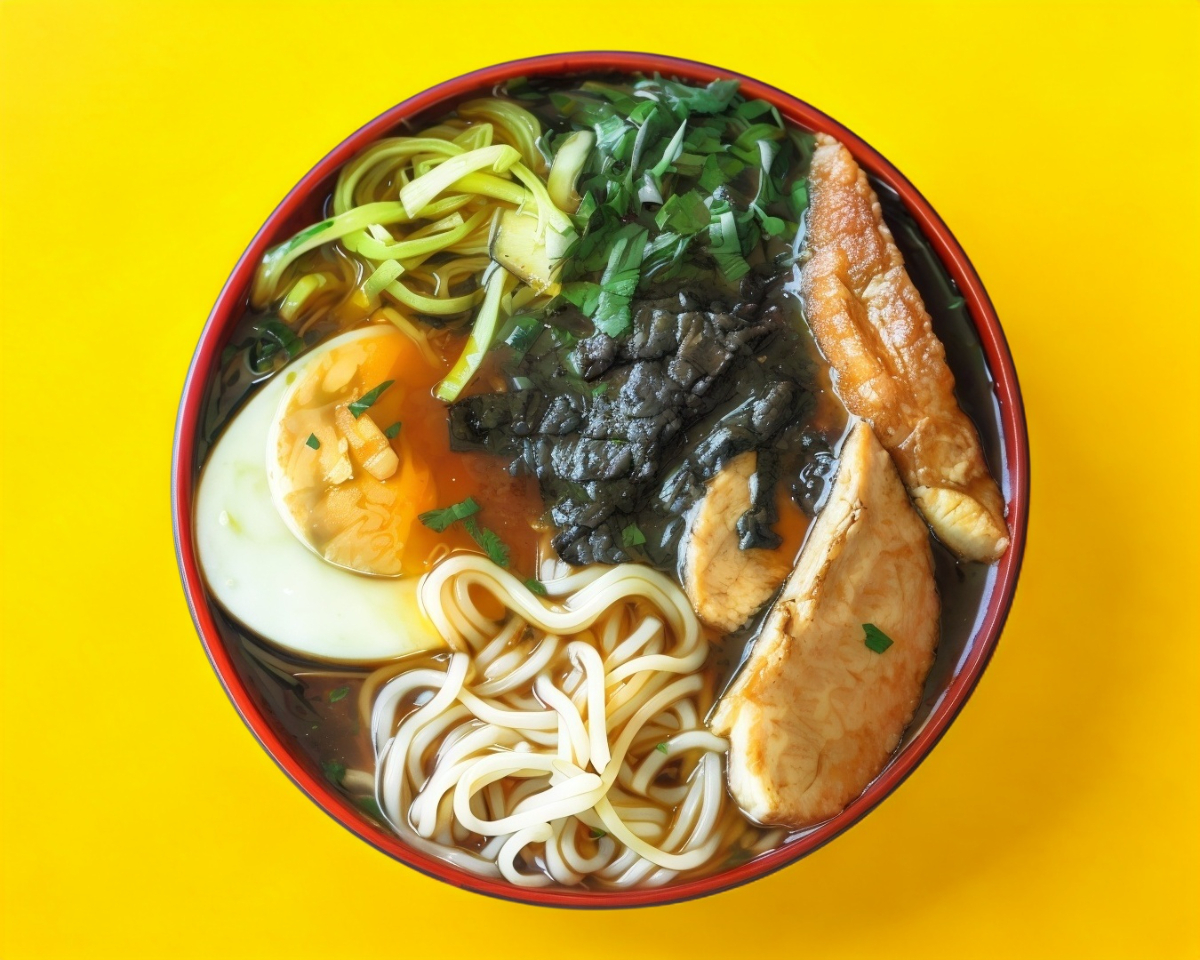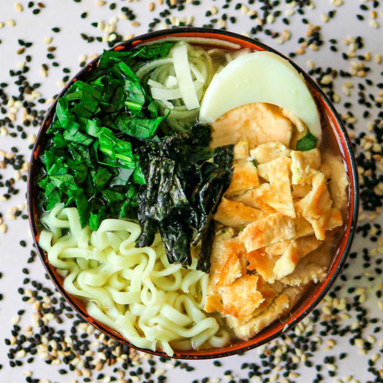 Pollo sazonado , huevo hervido,pasta ramen , tiritas de espinaca , alga nori , cebollin. 500 ml