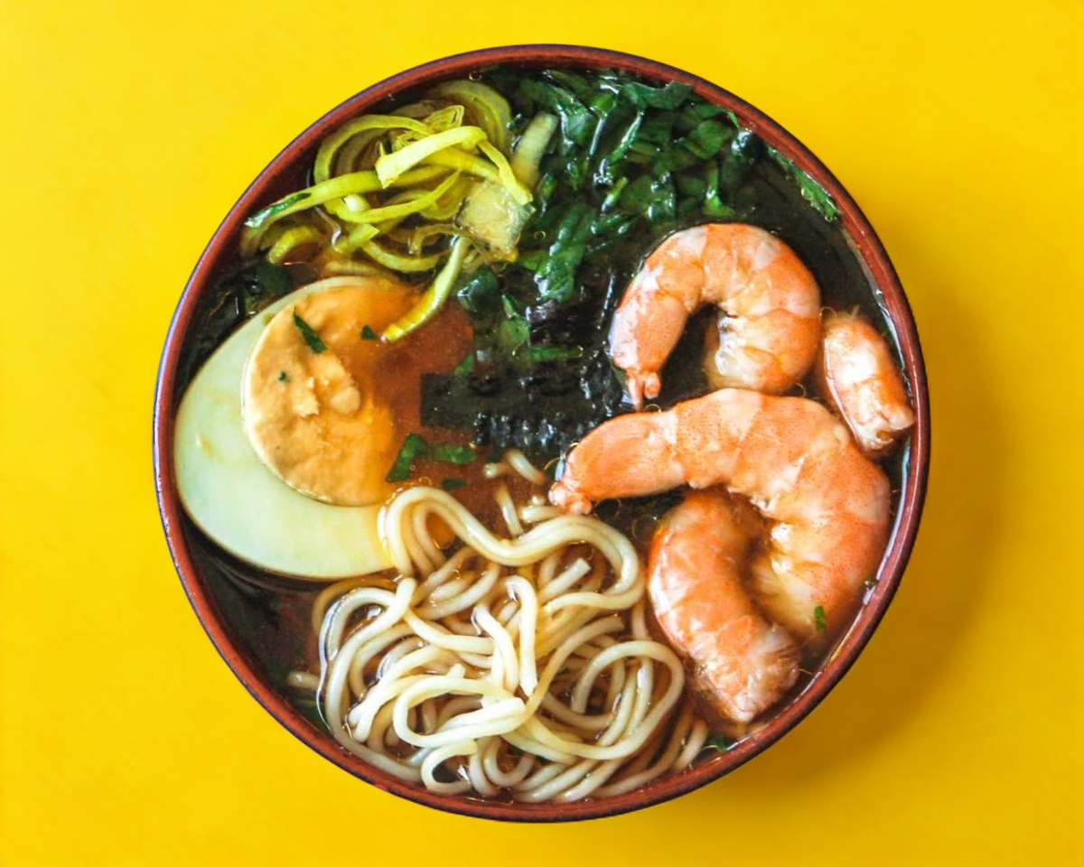Camaron , huevo hervido,pasta ramen , champiñón , cilantro, elote Amarillo , julianas de cebolla morada y espinaca. 500 ml