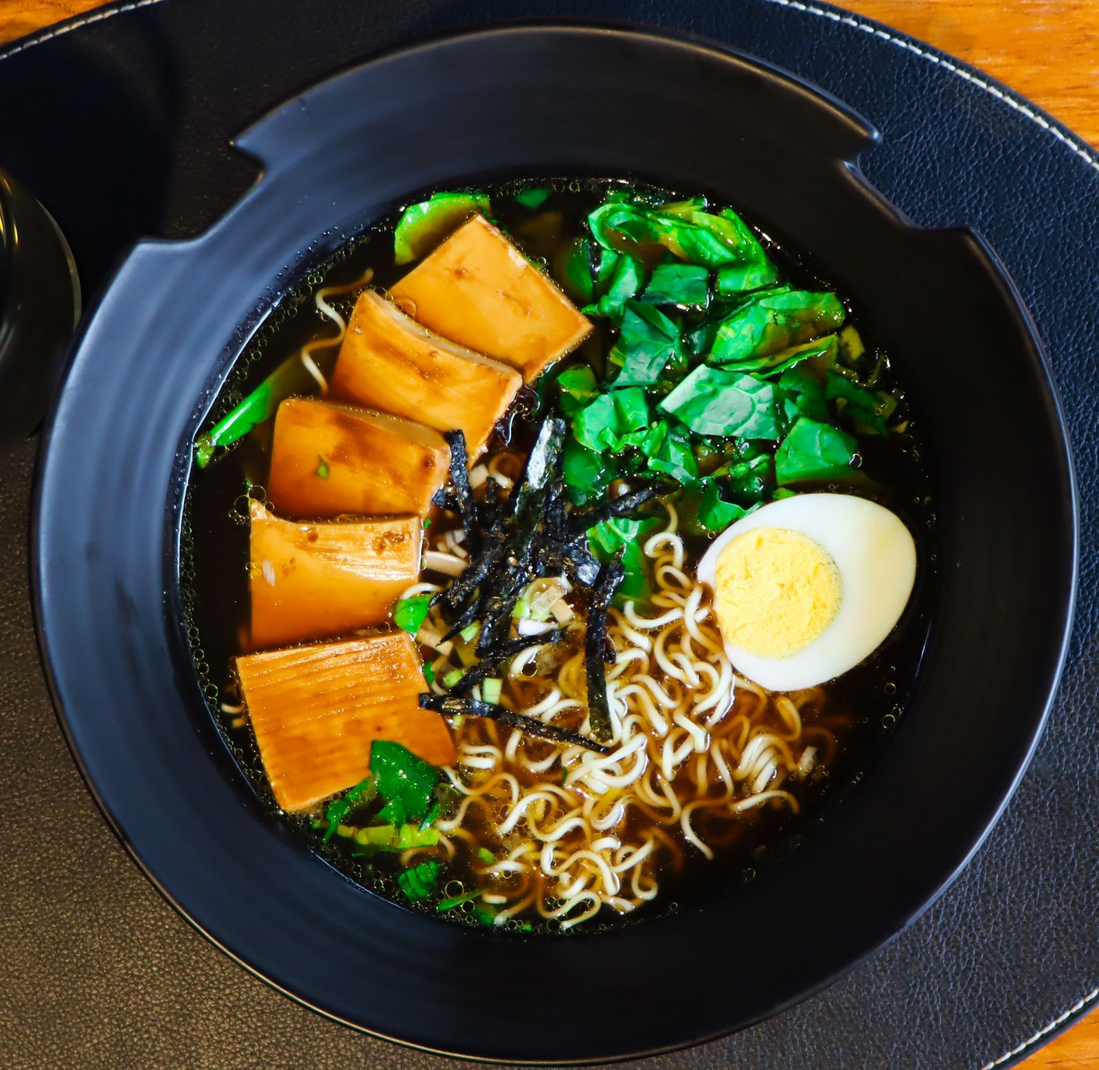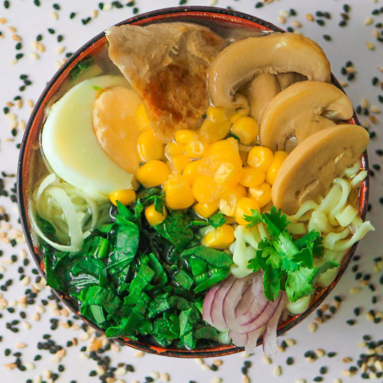 Tofu sazonado , huevo hervido,pasta ramen , champiñón , elote amarillo , julianas de cebolla morada,pasta y espinaca.