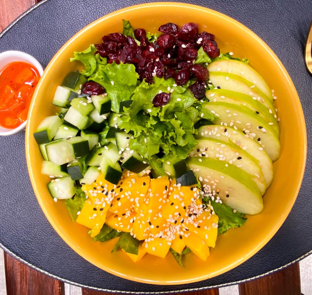 Fresca selección de Lechugas acompañadas de Mango , manzana , arándano, pepino y ajonjolí .