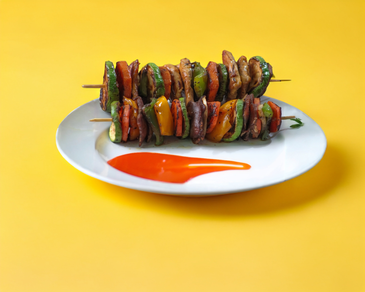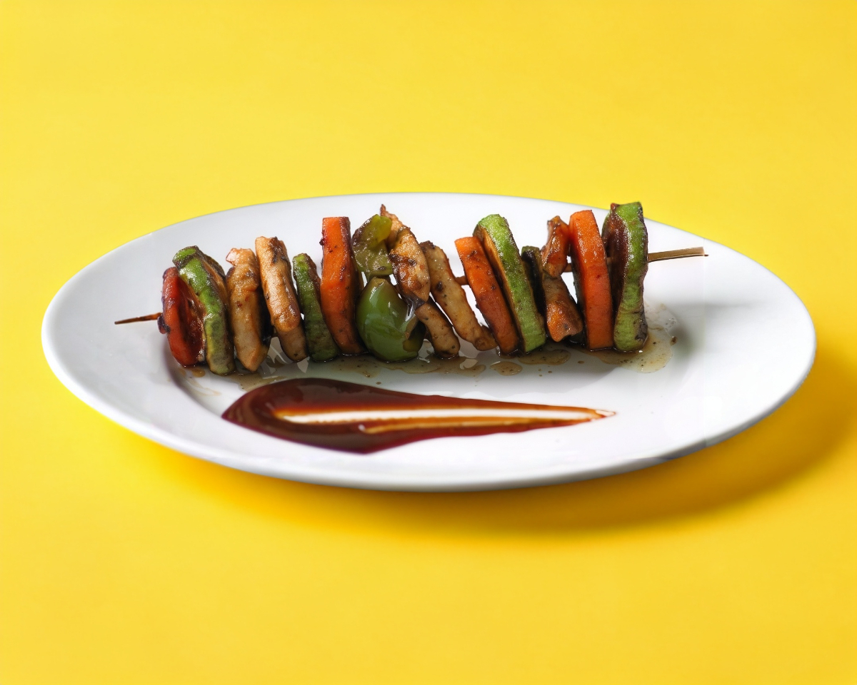 2 brochetas de pollo y 2 brocheta de Carne con Mix de Verduras ( pimiento , calabaza , zanahoria y cebolla ). Acompañado de Salsa a elegir .