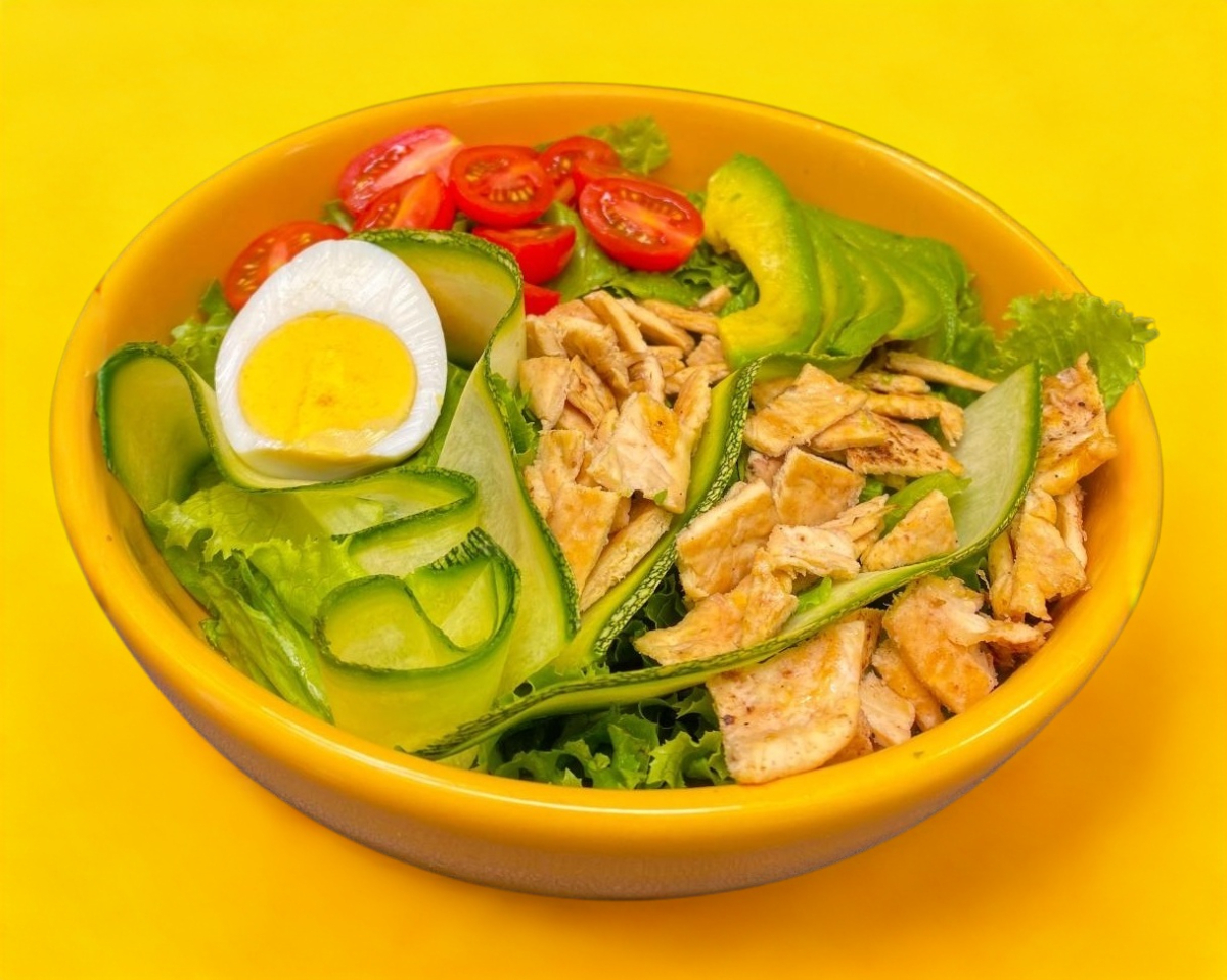 Selección de Lechugas acompañadas de láminas de calabaza Fresca , jitomate , pollo sazonado ,medio huevo hervido y abanico de aguacate .