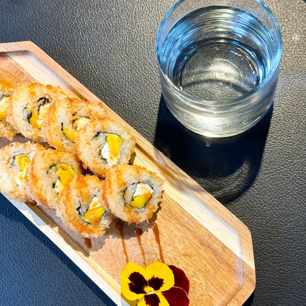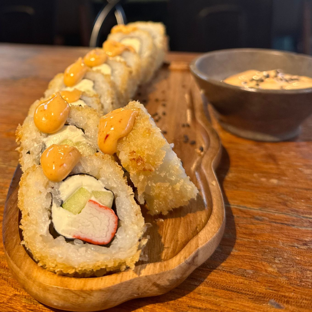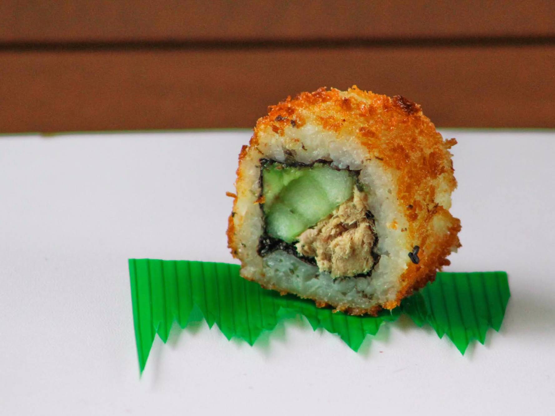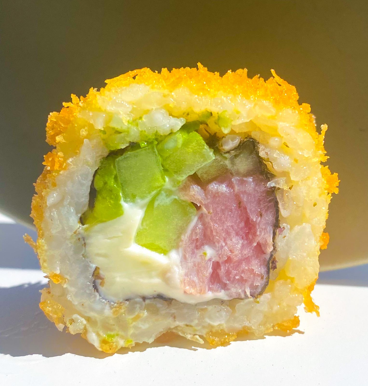 Atún crudo,queso crema , pepino, aguacate y alga nori por dentro; arroz marinado y Frito con panko por fuera . Acompañado de salsa soya a elegir