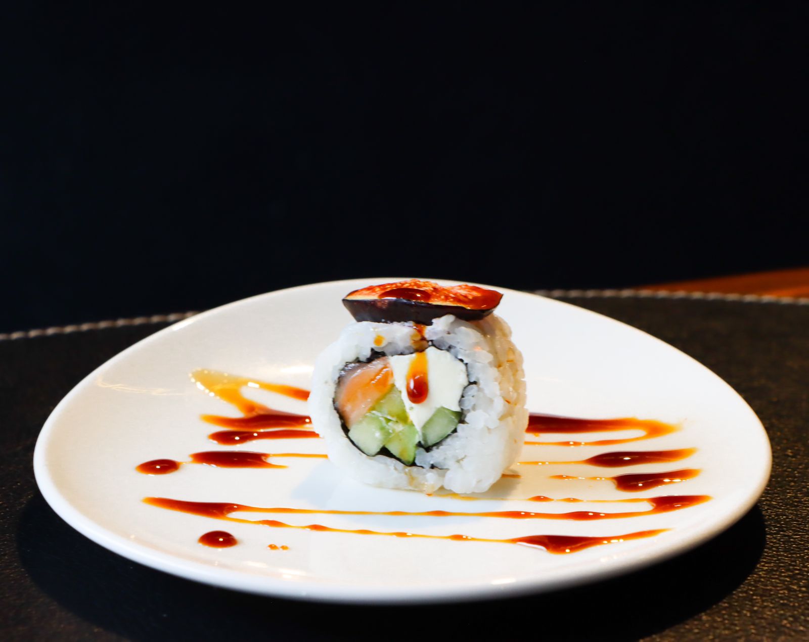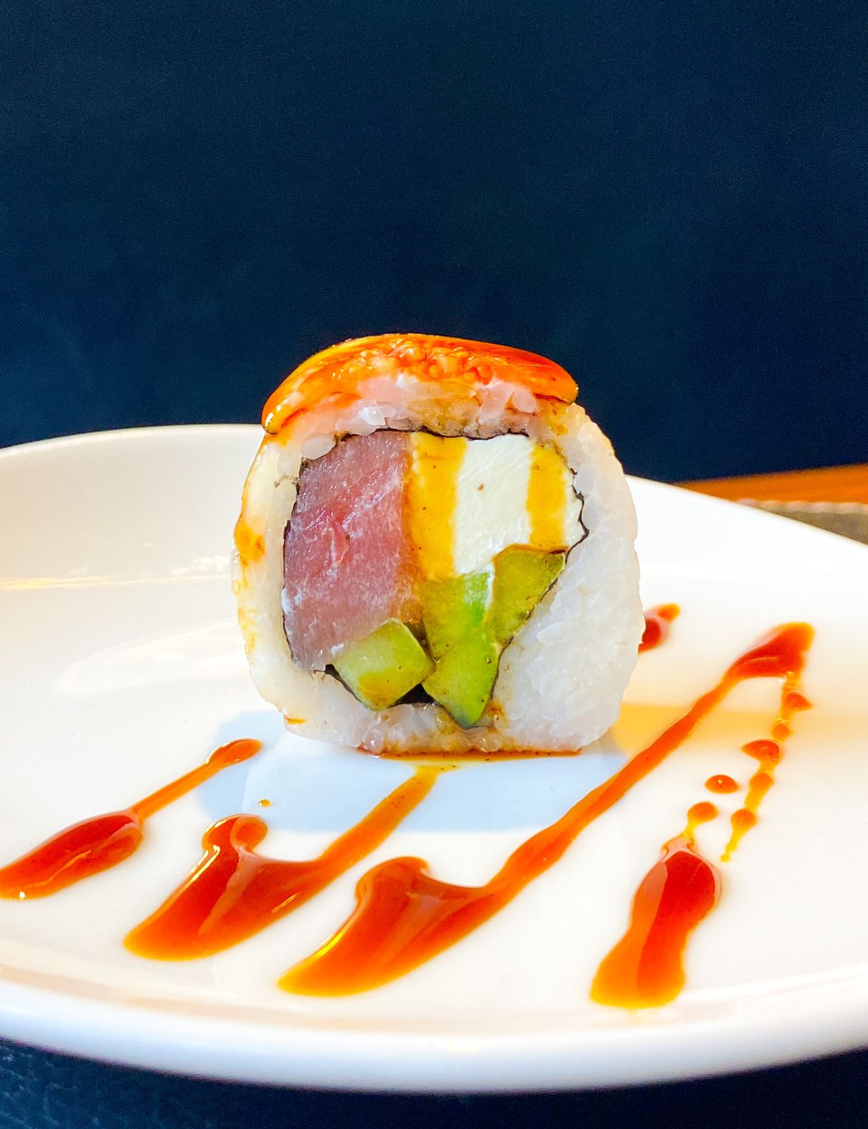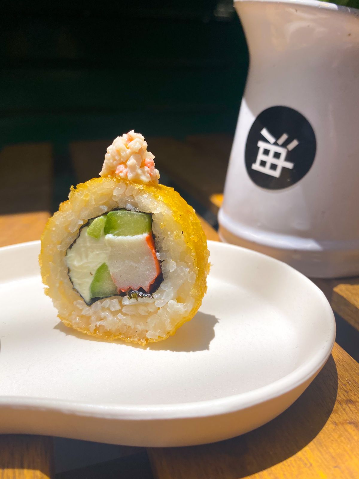 Atún crudo,queso crema , pepino, aguacate y alga nori por dentro; arroz marinado y Frito con panko por fuera . Acompañado de salsa soya a elegir