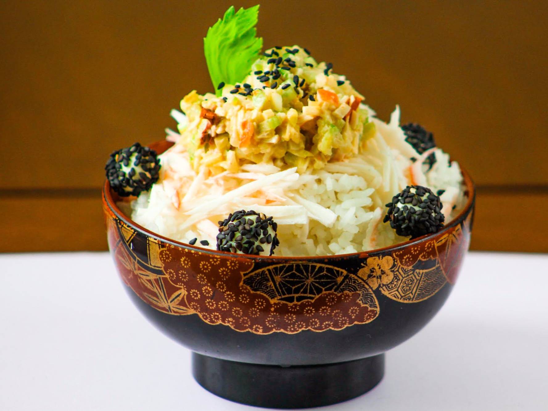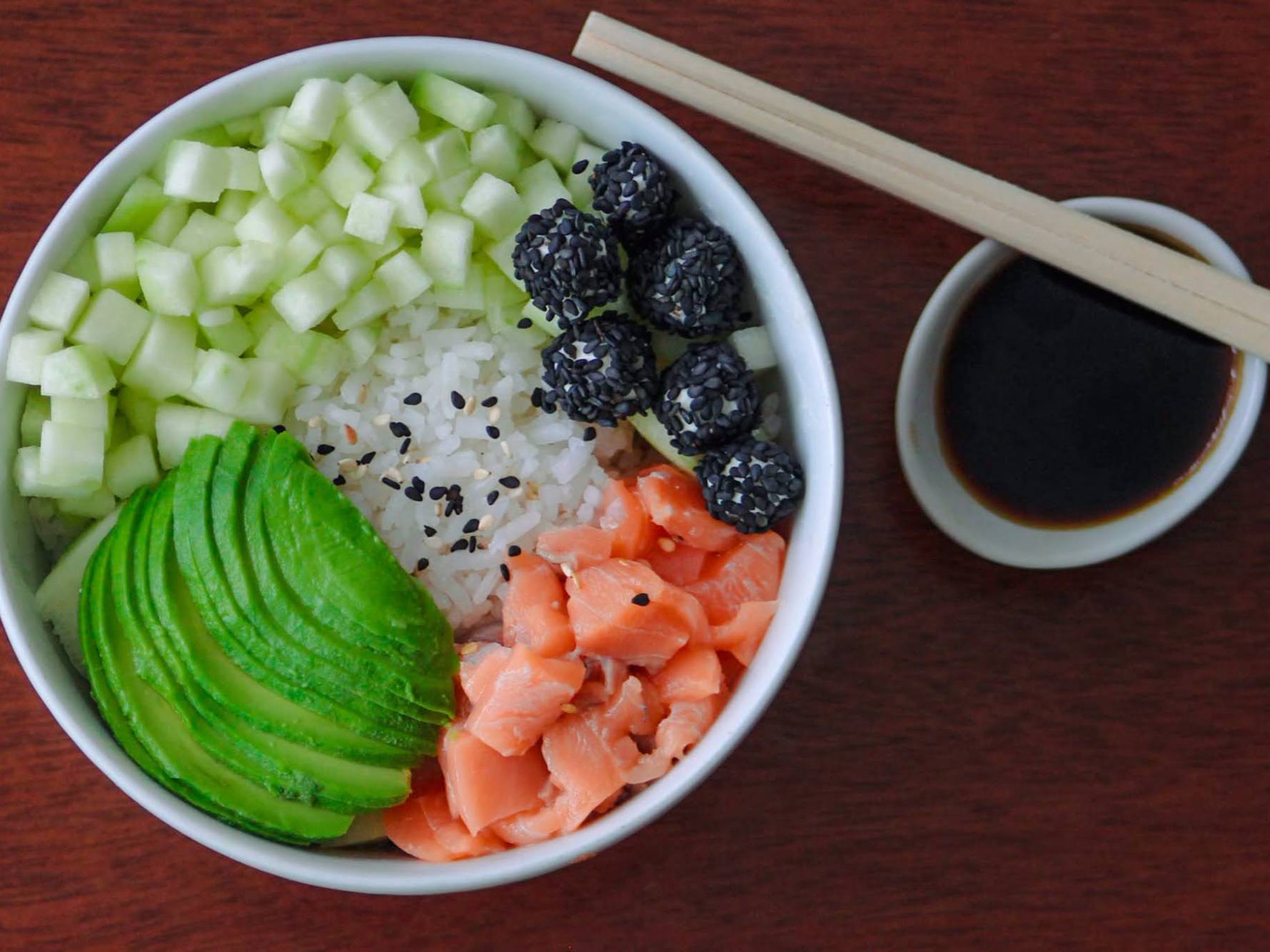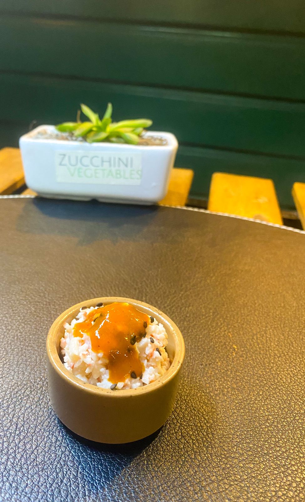 Arroz al vapor marinado con Salmon , topping de Pepino , aguacate ,bolitas de queso crema y ajonjolí. Acompañado de salsaSalsa Soya
