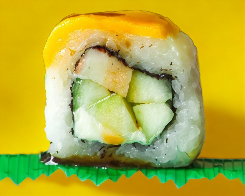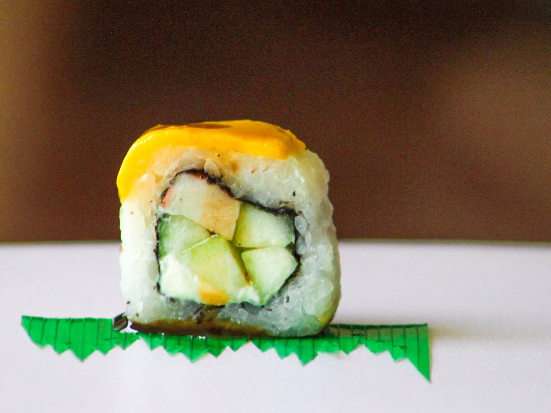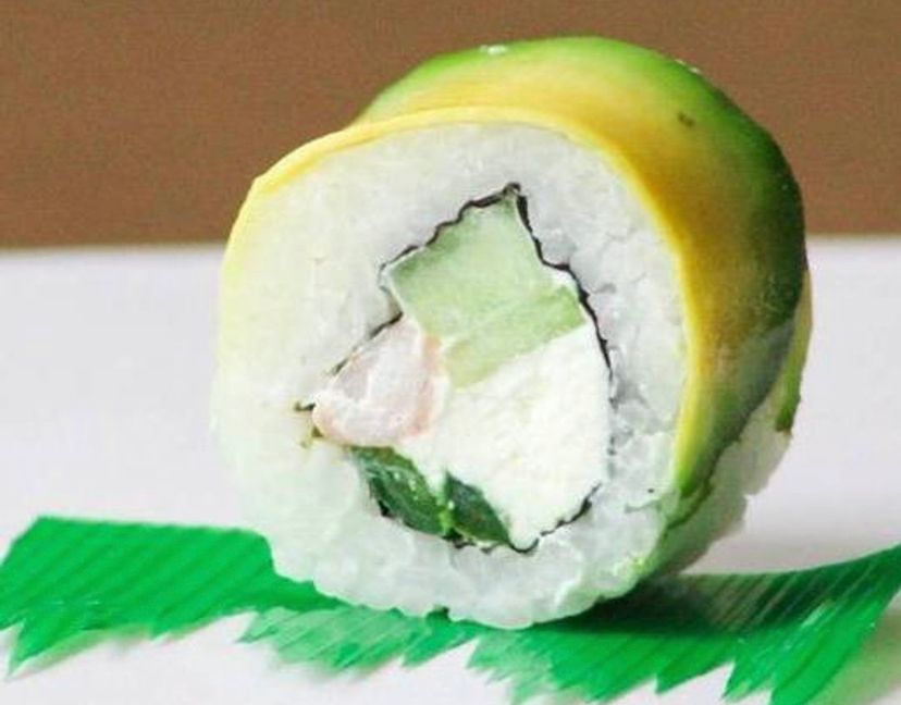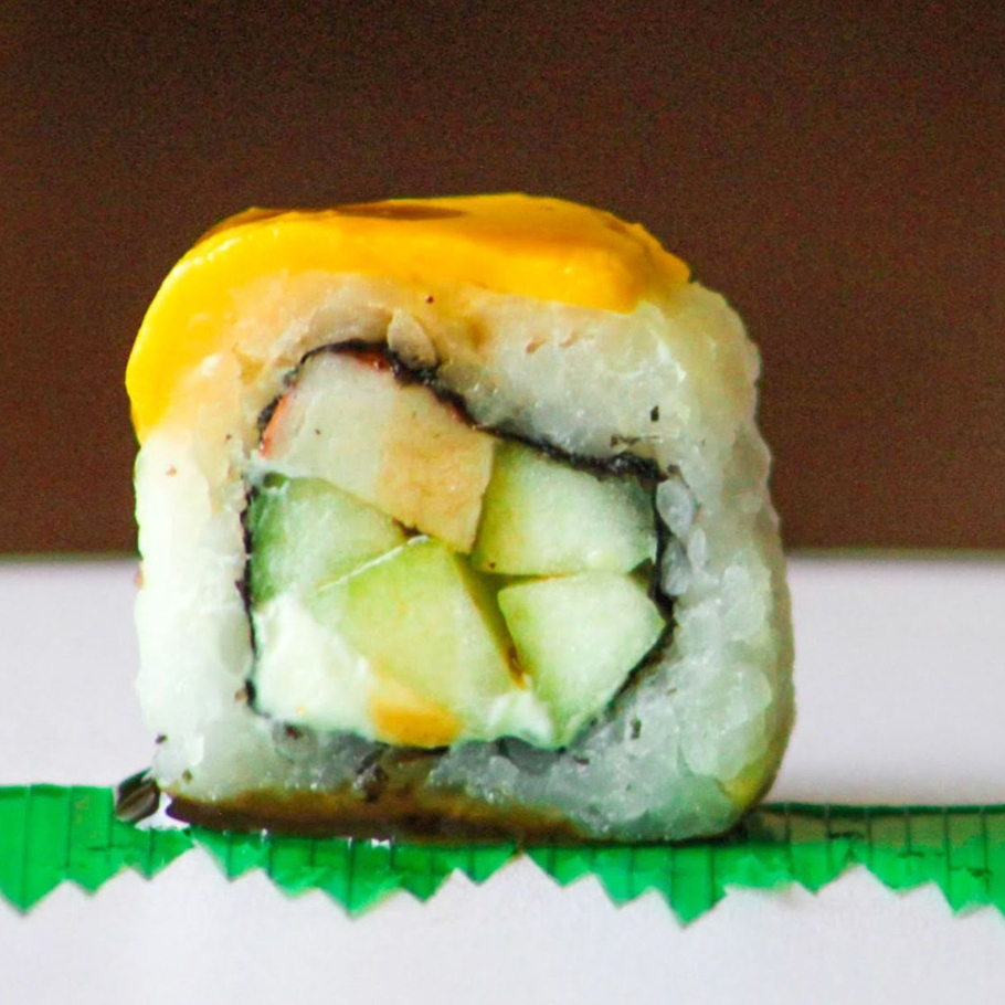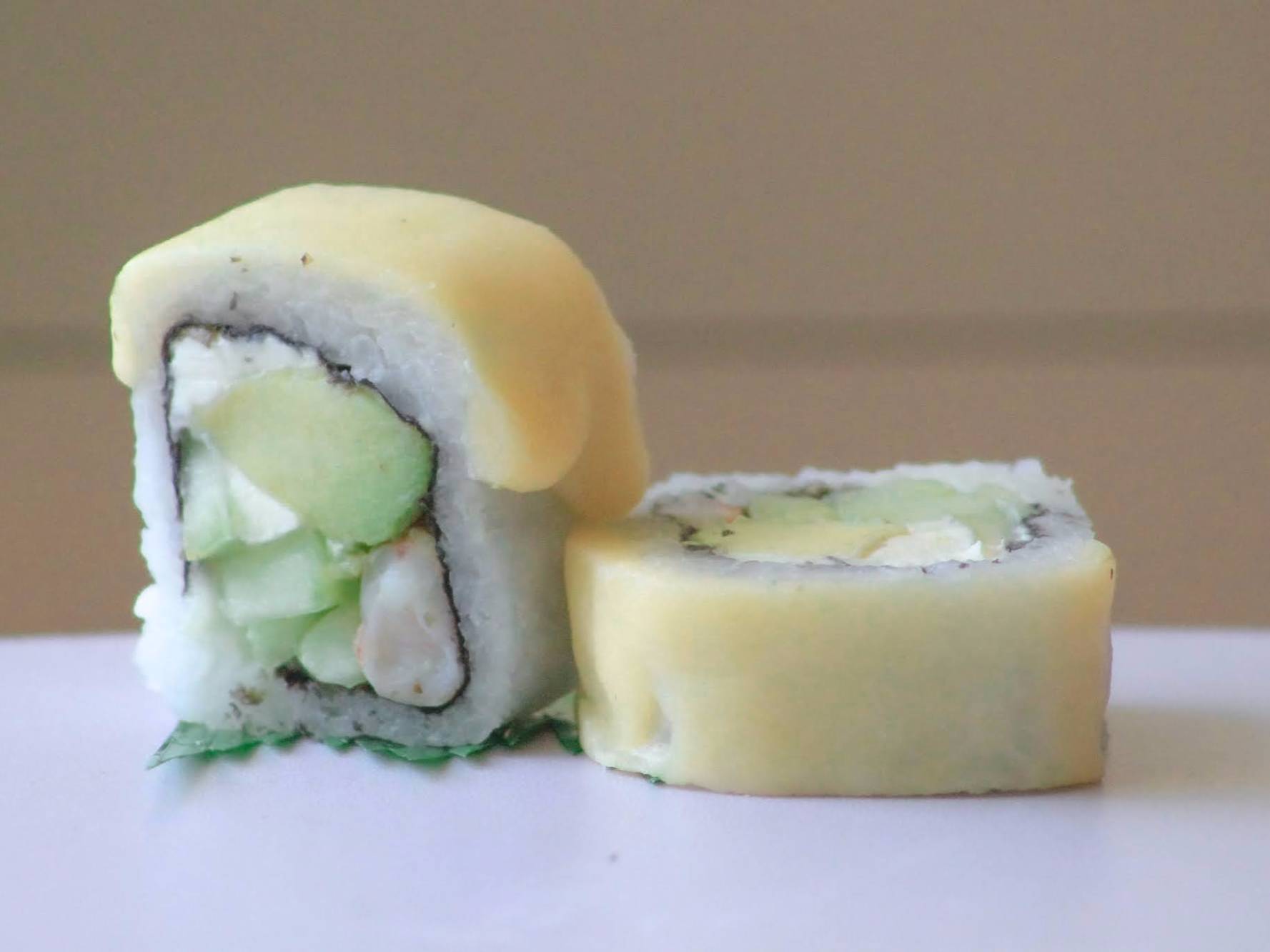 Por dentro alga nori, queso crema , surimi , pepino; por fuera arroz sushi marinado y mango con soya a elegir .