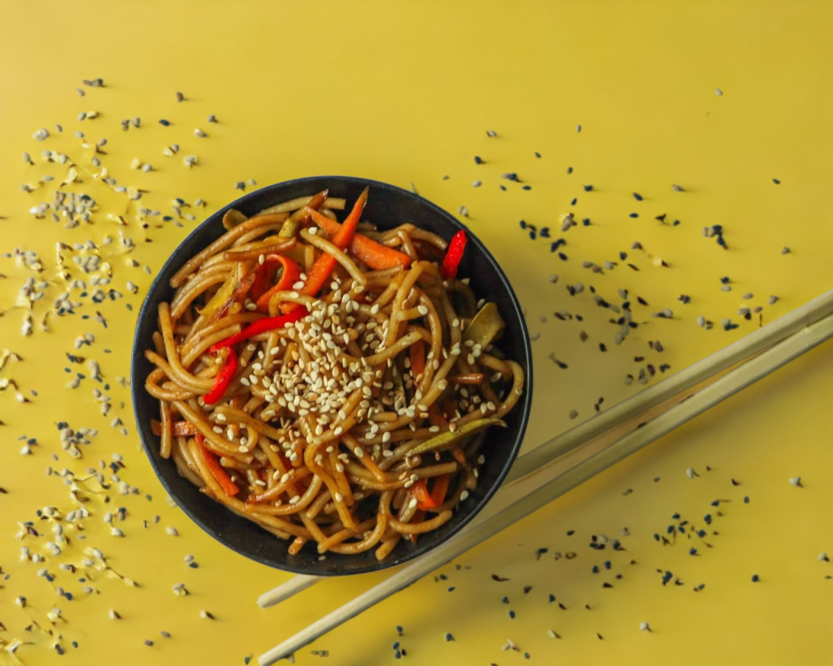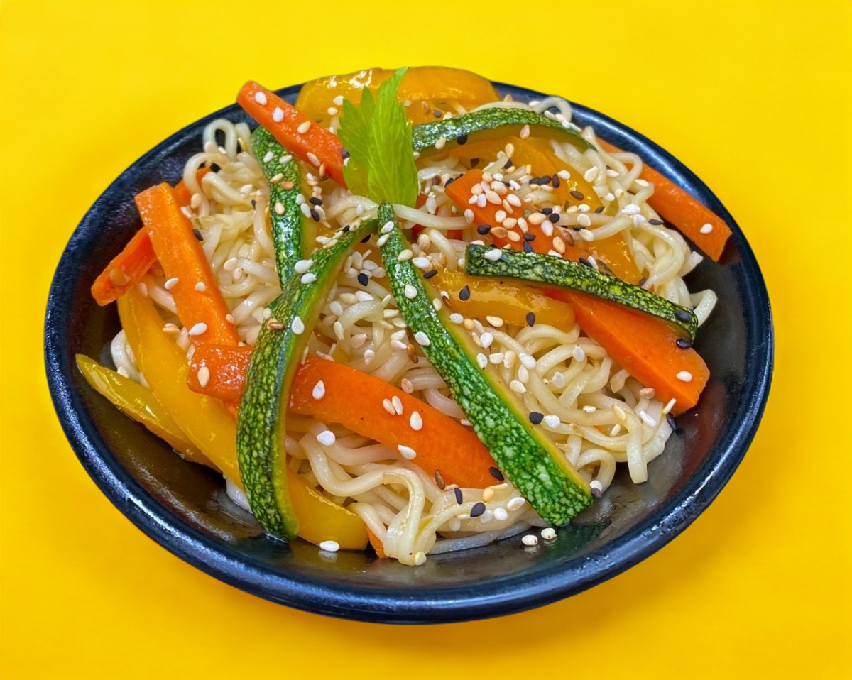 Noodles acompañados con mix de verduras ( pimiento , calabaza , zanahoria y cebolla) y sazonados .