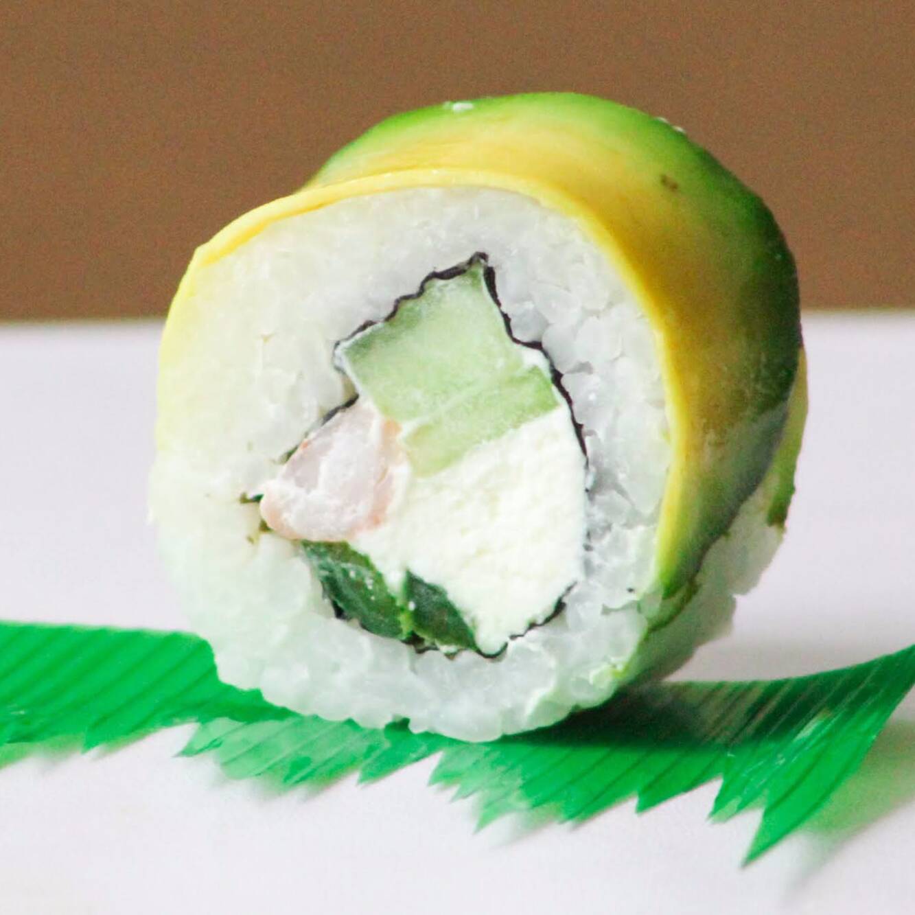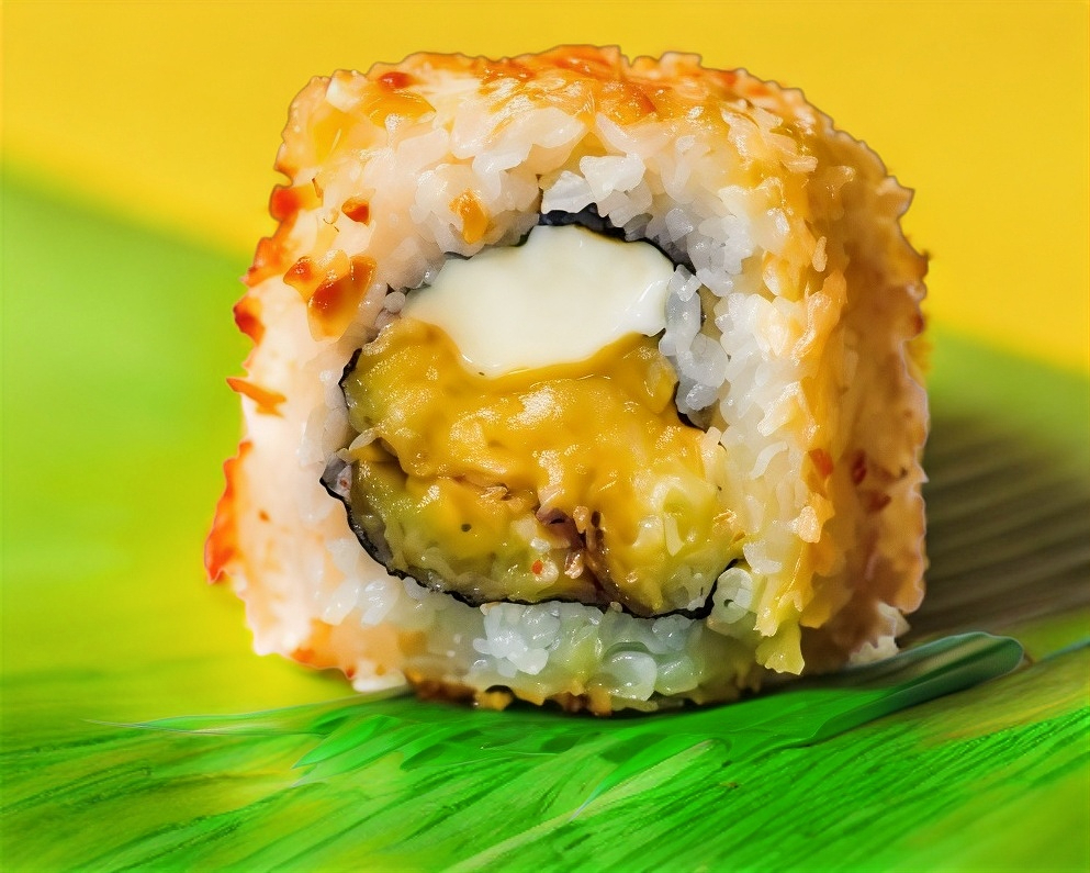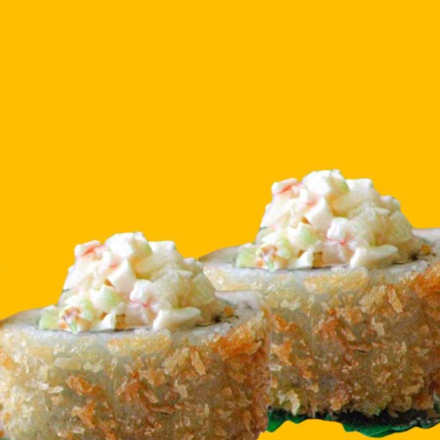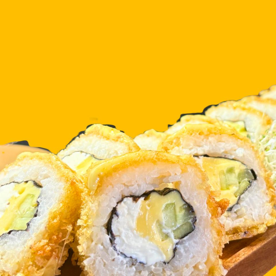 Aguacate , queso crema , queso gouda, pepino y alga nori por dentro; arroz marinado , frito con panko y cubierto de queso gouda gratinado por fuera. Acompañado de soya o dip.