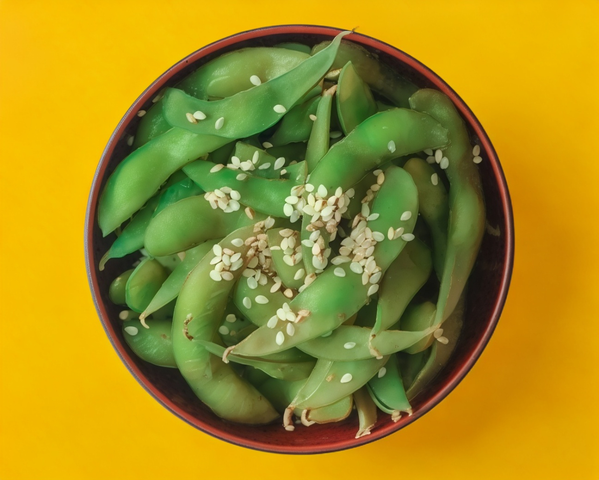 Frijoles de soya sazonados, acompañados con salsa de soya.