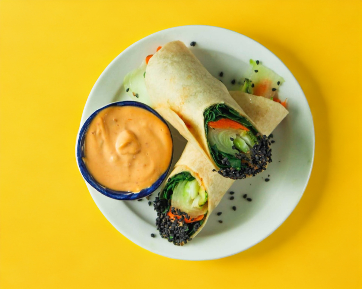 Orden de 4 pequeños taquitos de calabaza, espinaca, apio, tiras de pepino y zanahoria envueltos en tortilla de harina. Acompañados con dip mousse de chipotle.