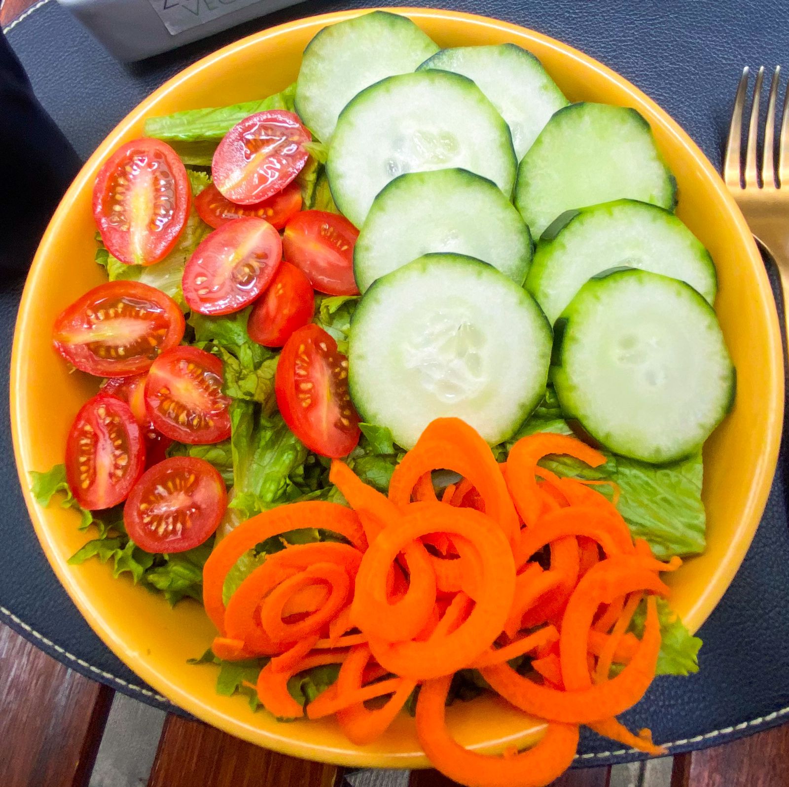 Mix de lechugas con pepino, jícama, zanahoria y jitomate. Acompañada con aderezo de mostaza con miel.