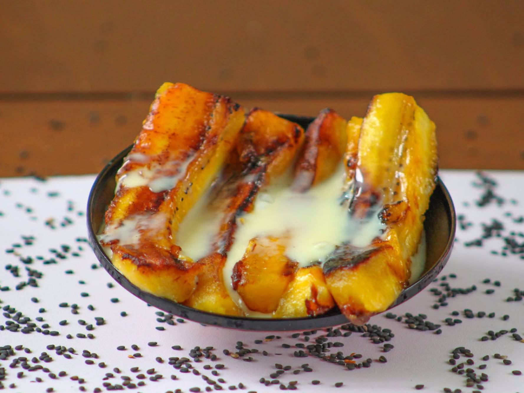 Brocheta de plátano macho relleno de queso crema empanizada y frita con panko. Acompañada Salsa dulce Especial