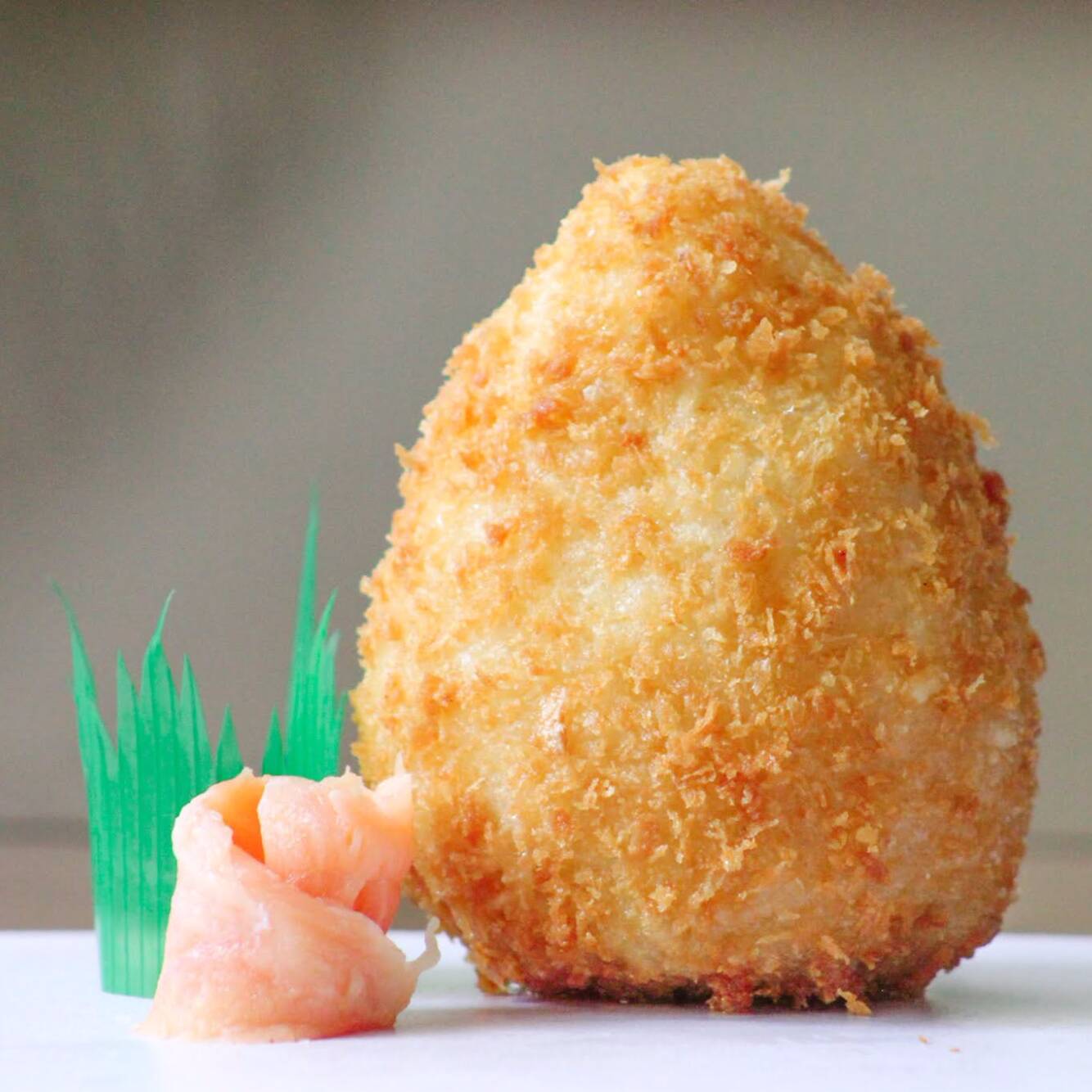 Bola de arroz al vapor marinado con queso crema , Pepino , Salmon y frita con panko . Acompañada de Salsa Soya y Tampico