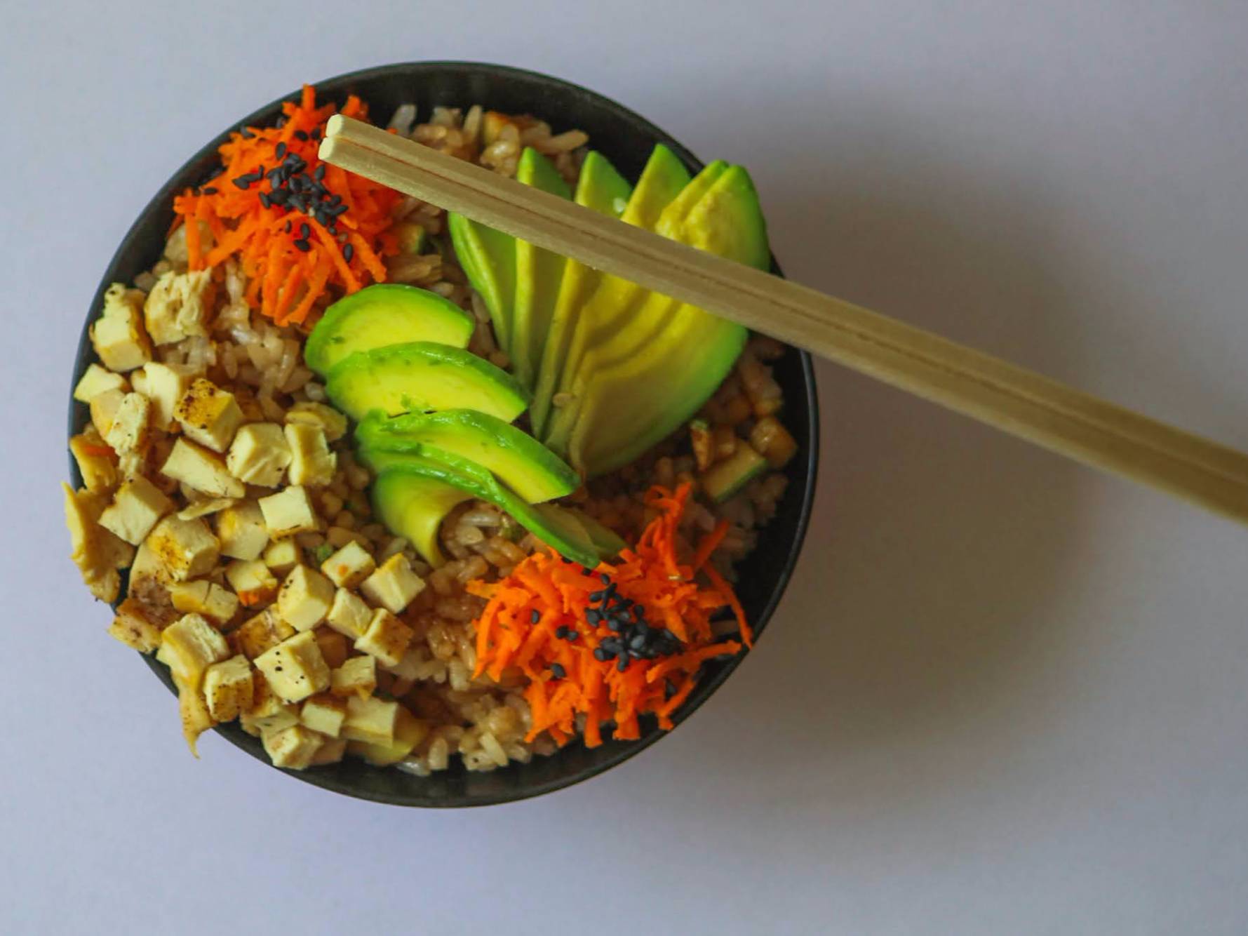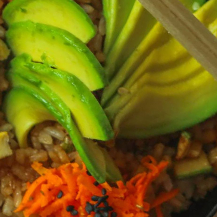 Arroz Gohan marinado con salsa Teriyaki acompañado de calabaza y ajonjolí ; como guarnición aguacate y zanahoria rallada .
