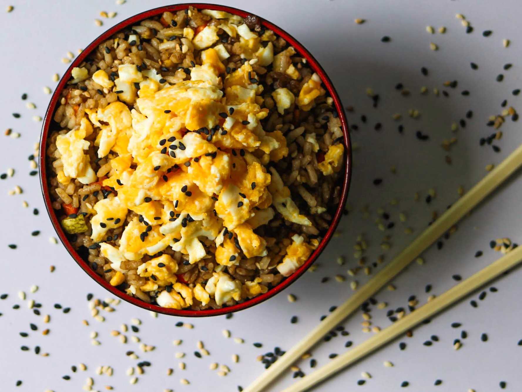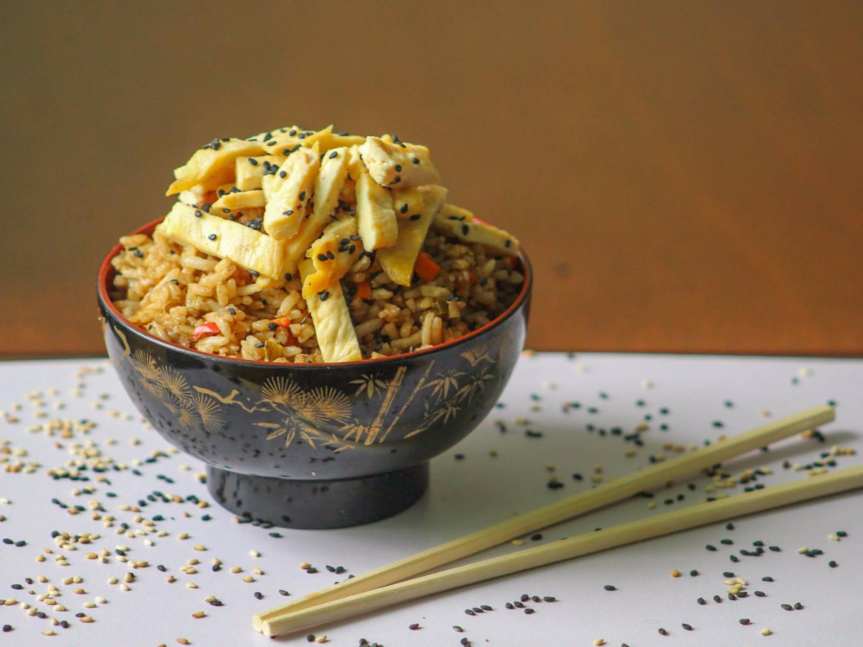 arroz frito y marinado con mix de verduras . Acompanado de camaron , pollo, carne y huevo .