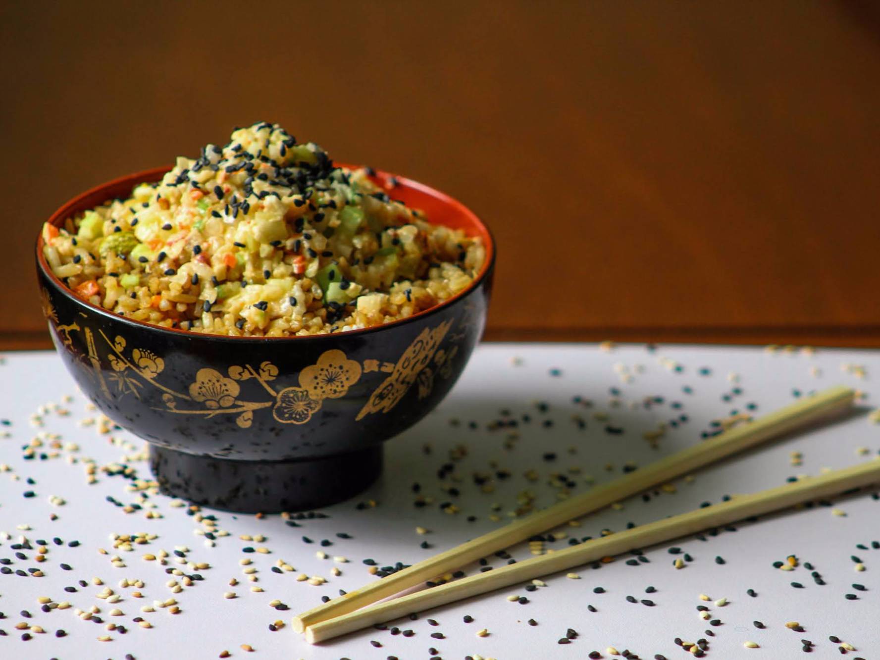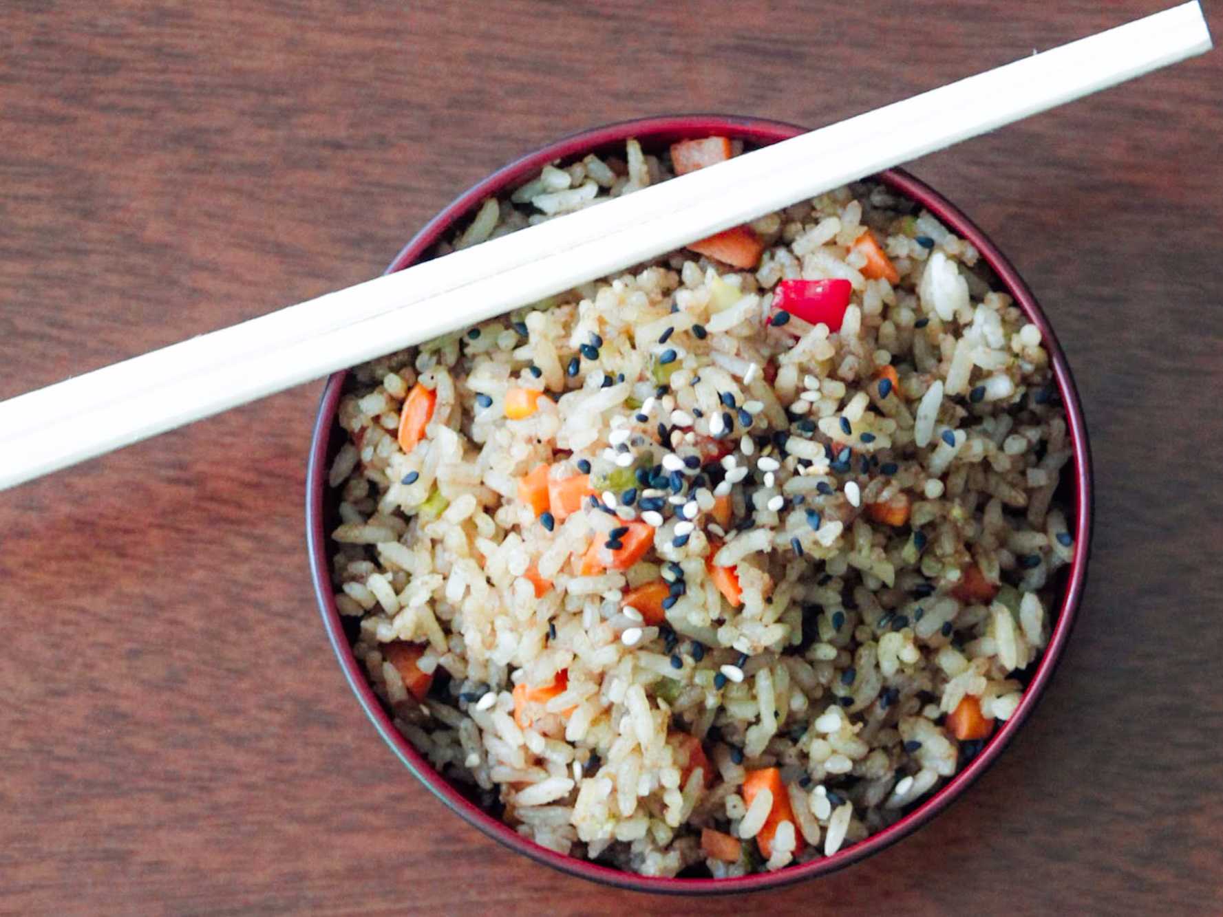 Arroz frito, sazonado con soya y especias y marinado con mix de Verduras asadas ( zanahoria , pimiento y calabaza ) , acompañado de Salsa Tampico