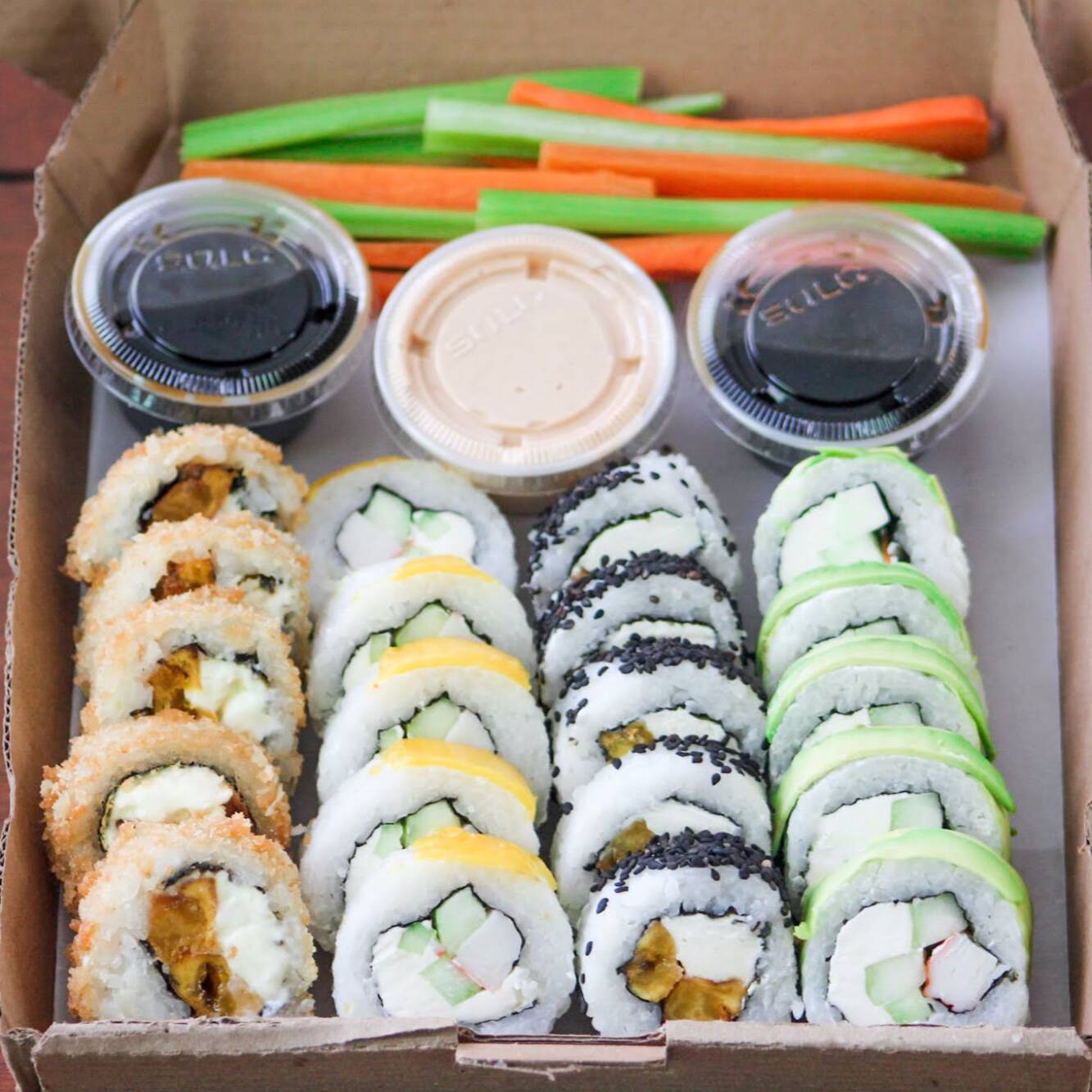1/2 rollo surimi chipotle , 1/2 rollo surimi mango , 1/2 rollo surimi ajonjoli y 1/2 rollo surimi pepino incluye 3 soyas a elegir , guarnición de verduras total 20 bocadillos