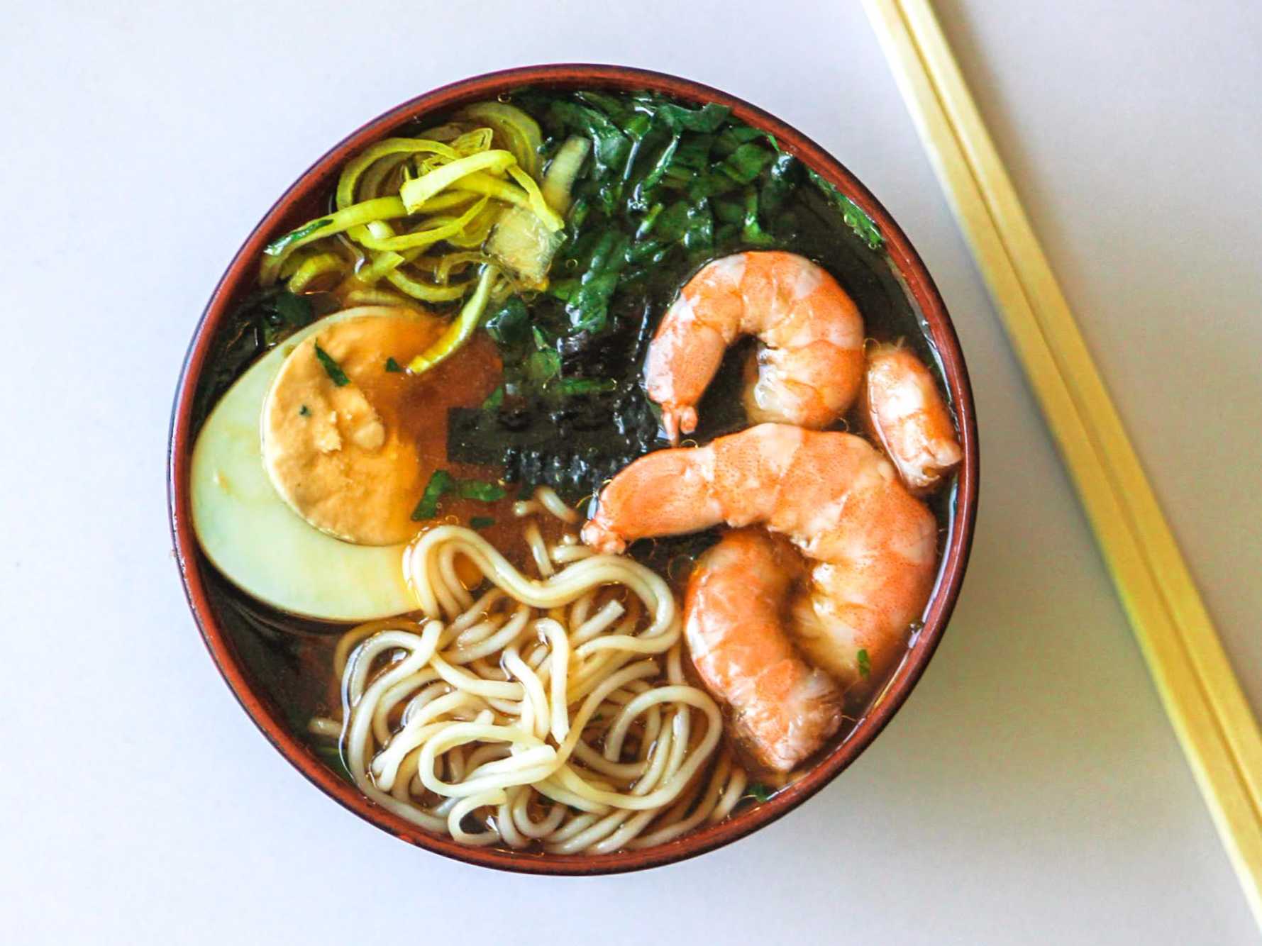 Camaron , hervida y sellada , huevo hervido,pasta ramen , tiritas de espinaca , alga nori , cebollin. 500 ml