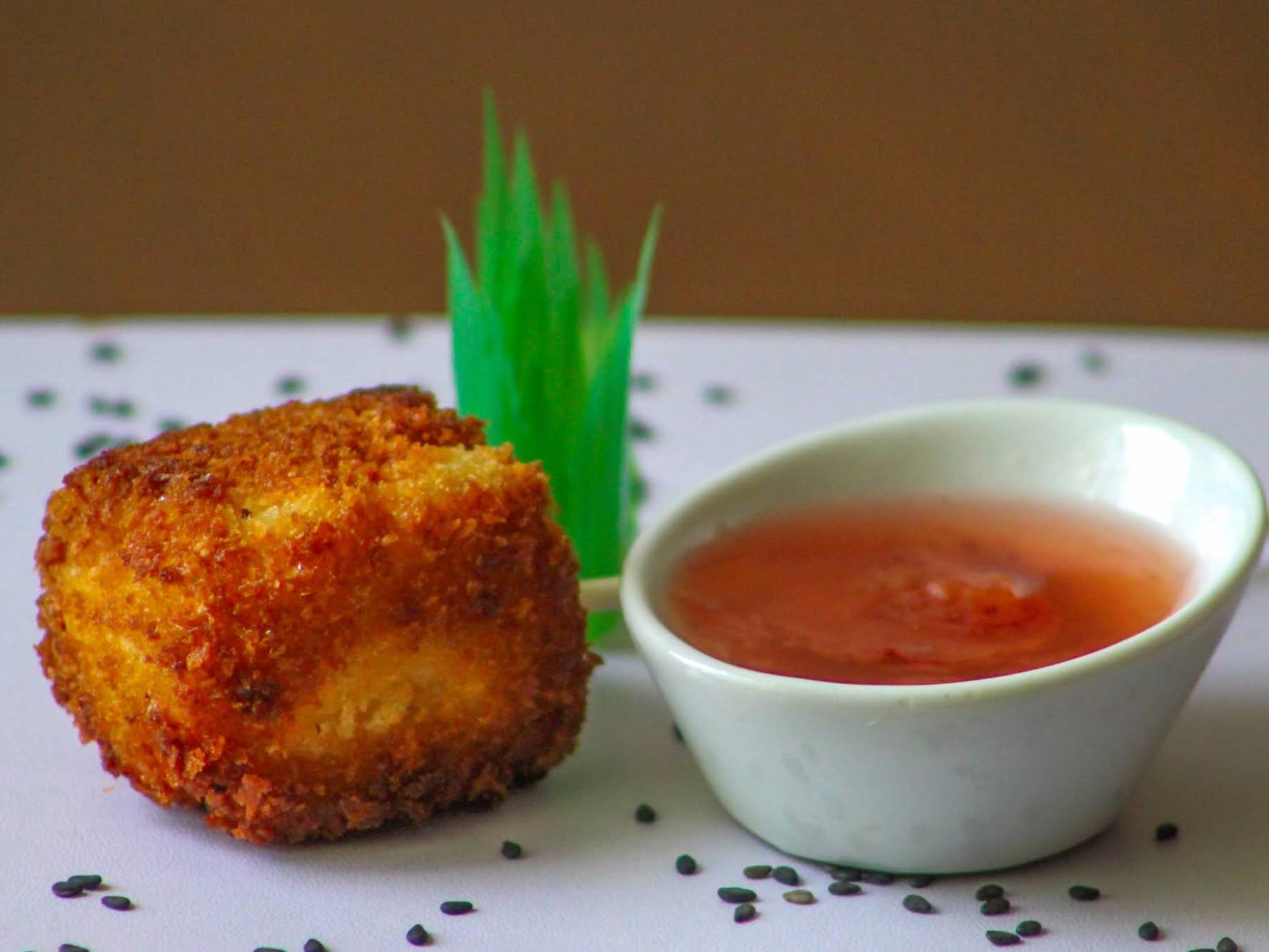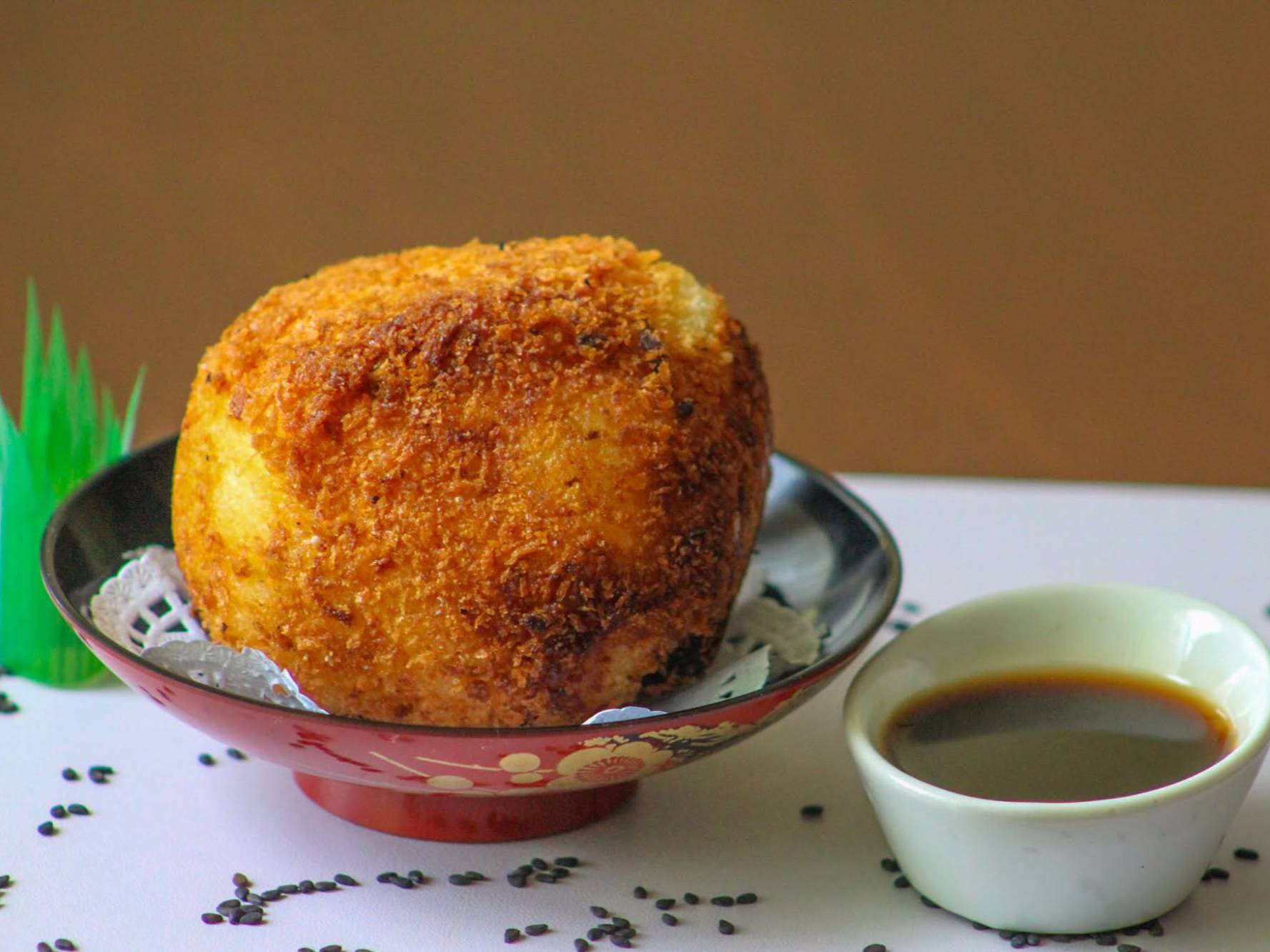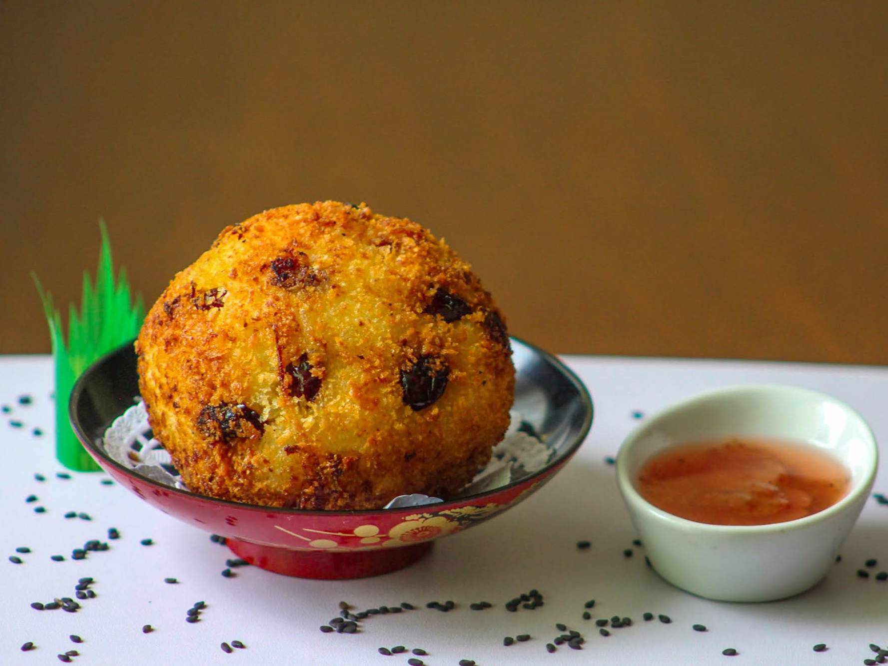 Bola de arroz al vapor Marinada y frita con panko . Rellena de queso crema , nuez y coco . Acompañada de Salsa dulce de la casa .