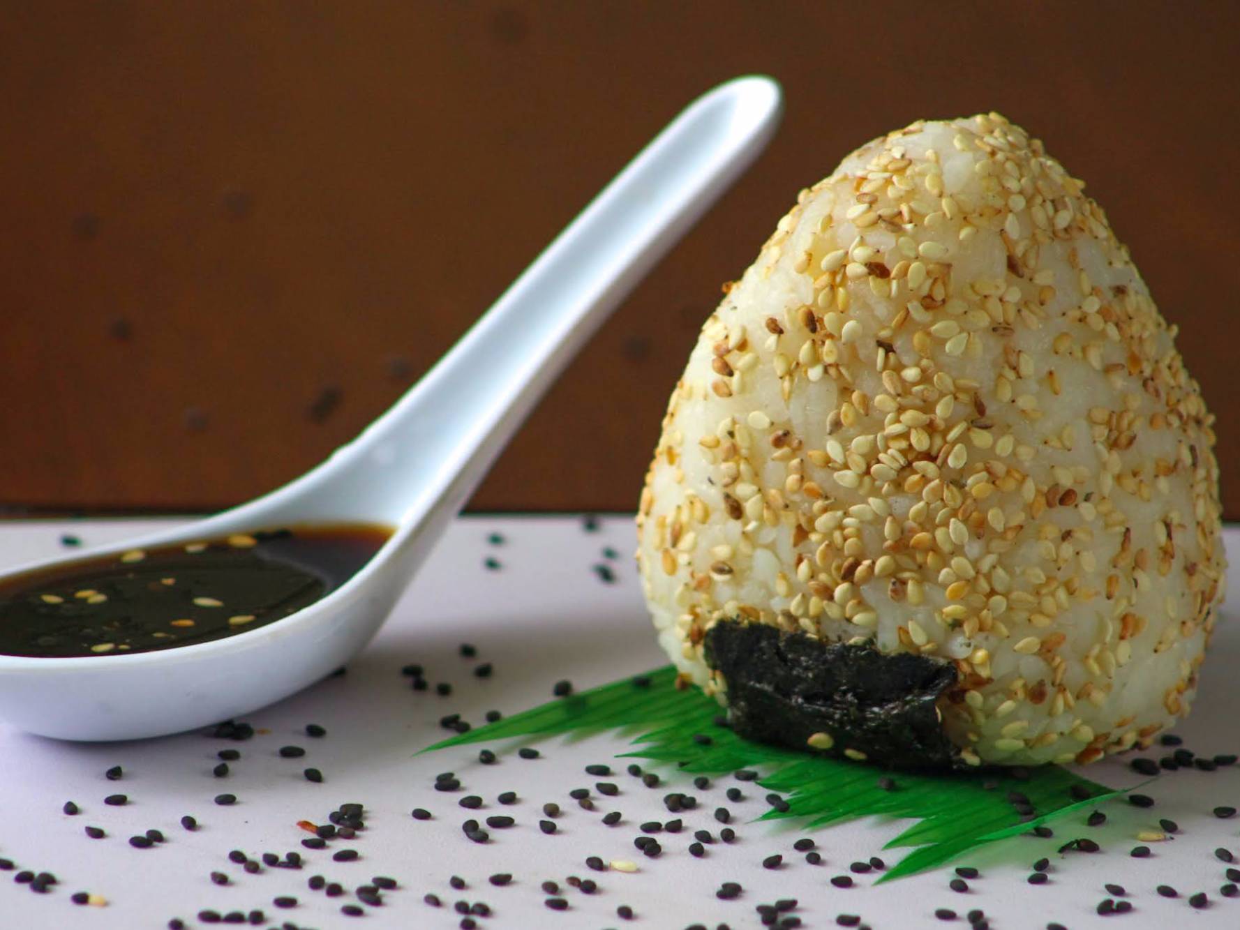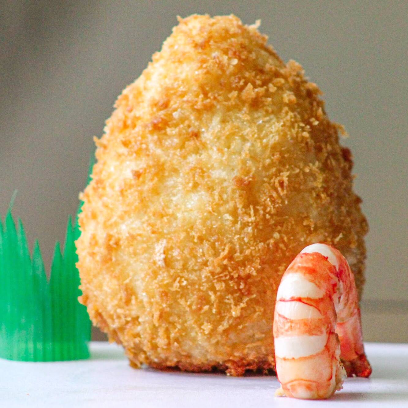 Triángulo de arroz al vapor marinado relleno de camaron y queso crema .Empanizado y frito con panko , acompañado de Salsa Soya .