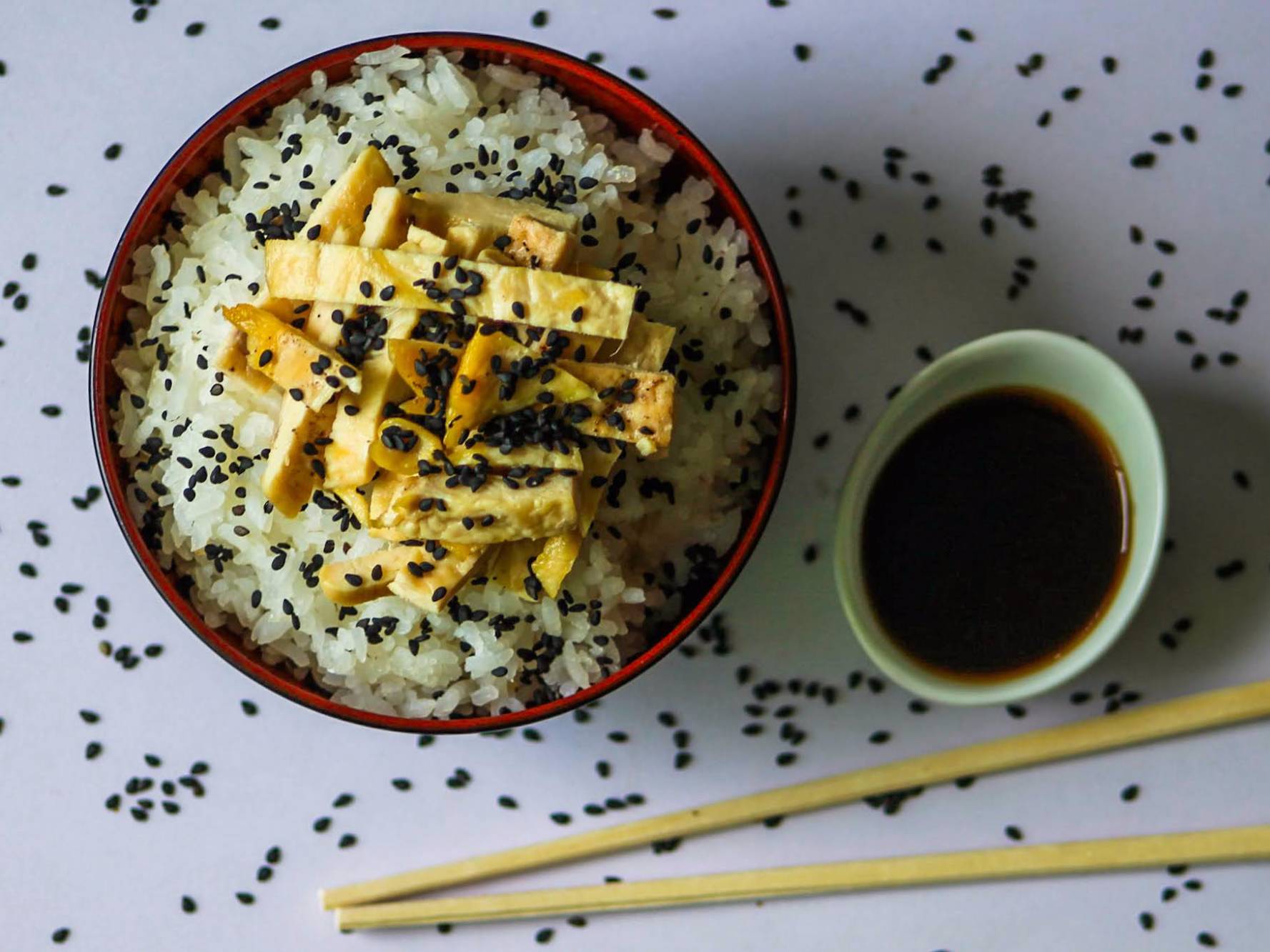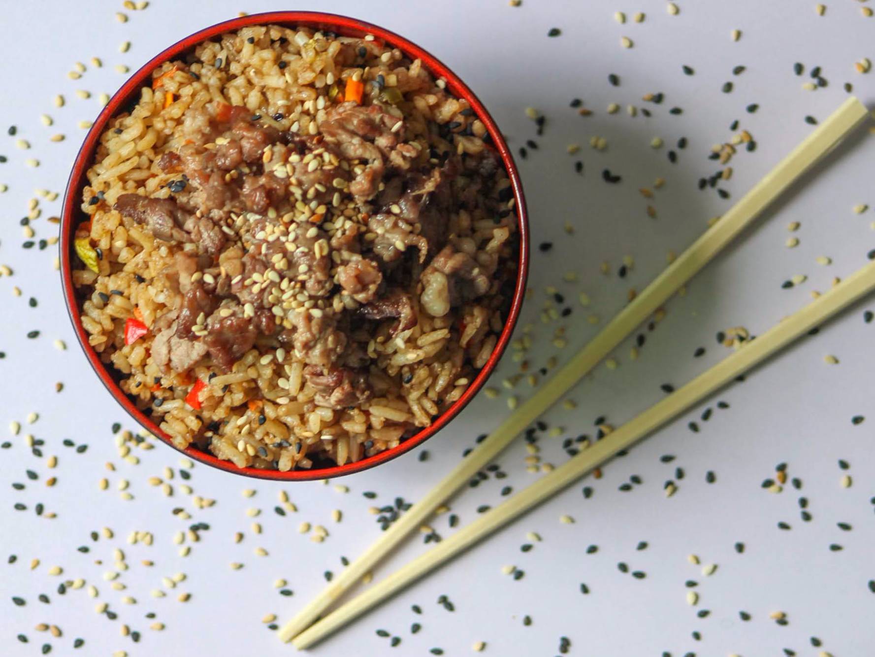 Arroz blanco al vapor, ajonjolí, tiras de pechuga de pollo marinadas y asadas.