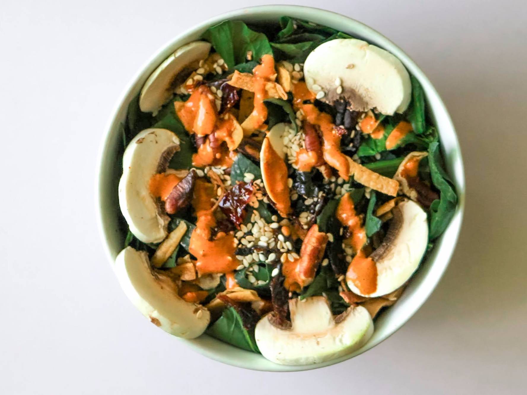 Espinaca con nuez frita, ajonjolí natural, tortilla frita y champiñón. Acompañada con aderezo de chile ancho.