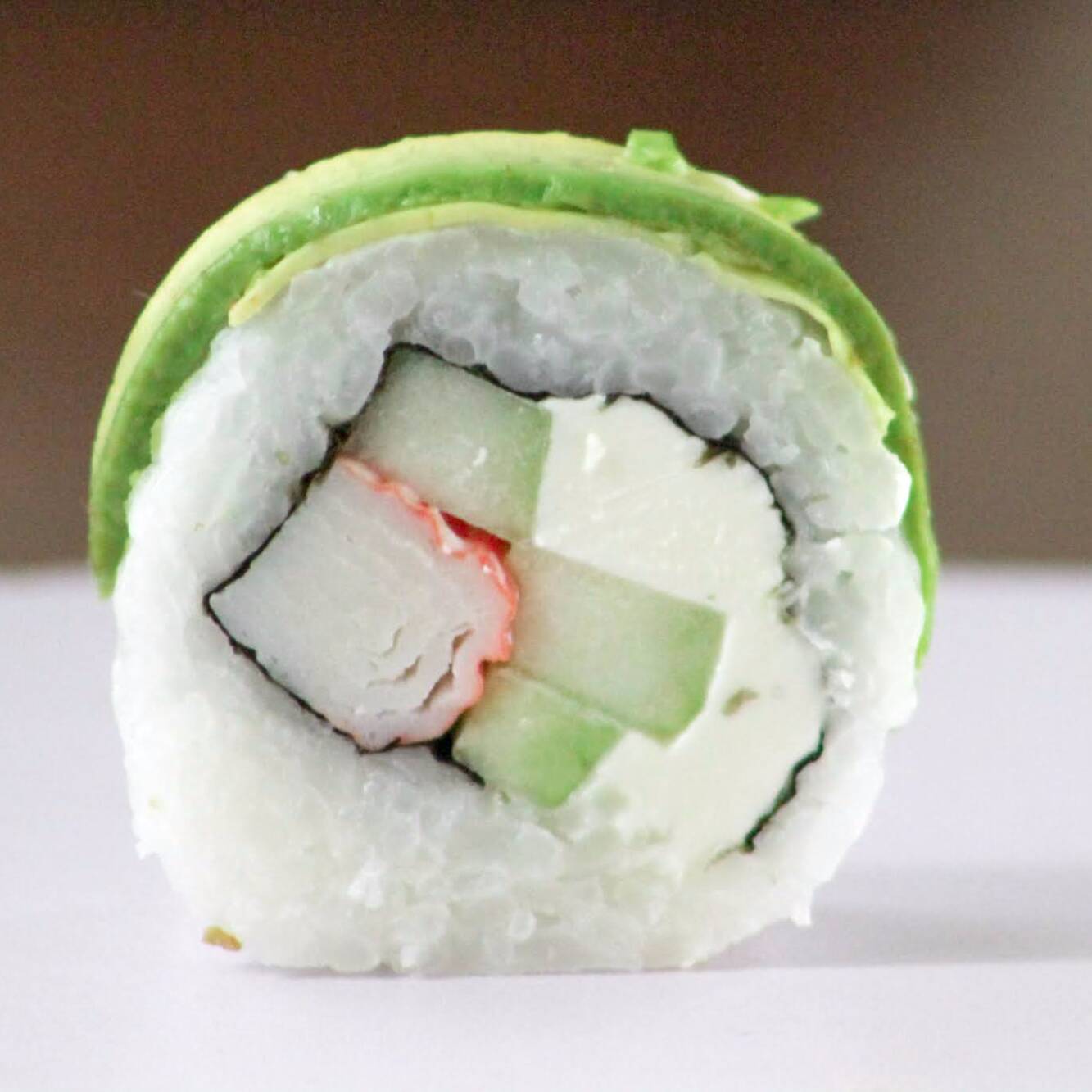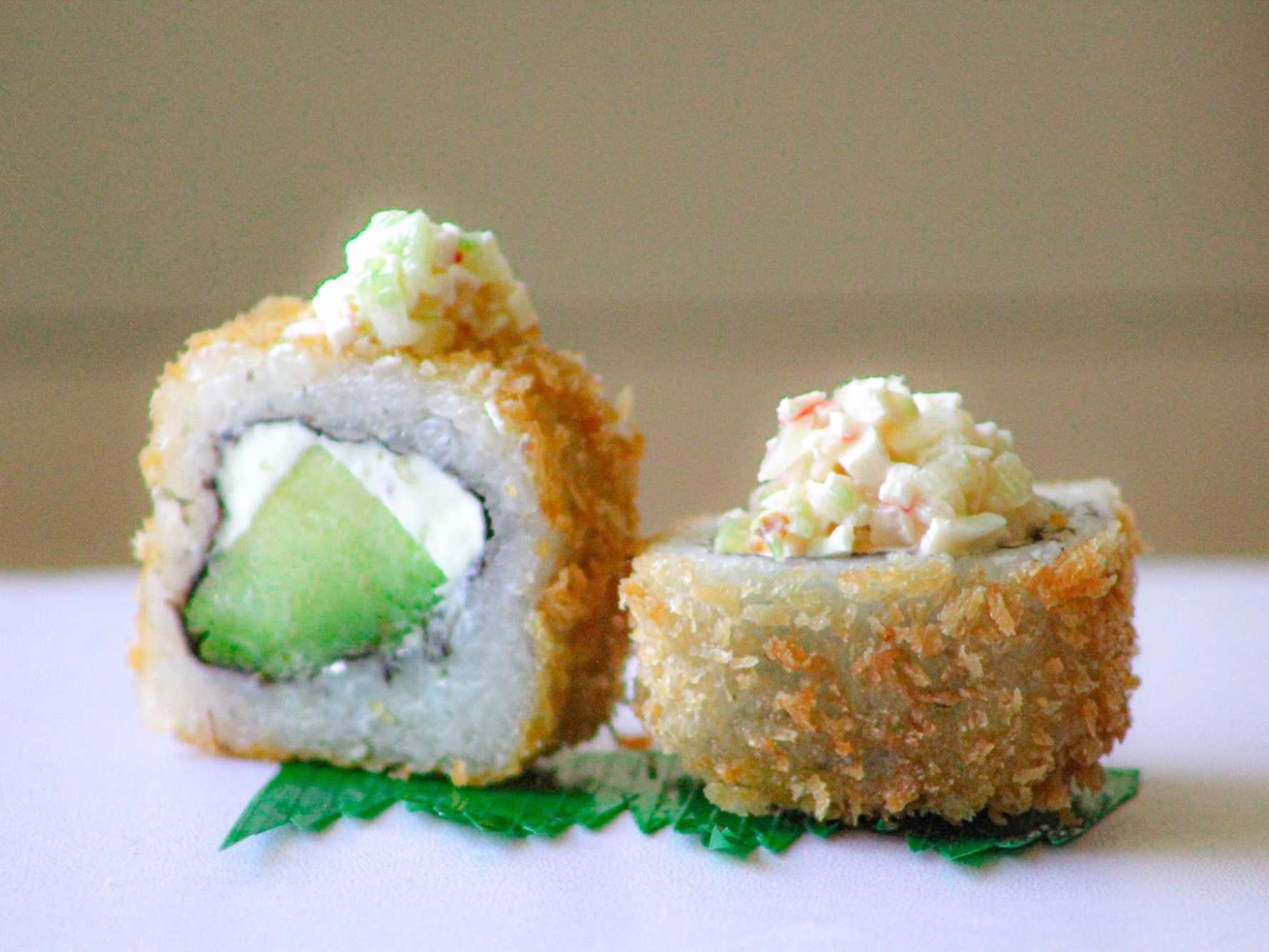 Queso crema, aguacate, camarones y alga nori por dentro; arroz marinado frito con panko y tampico