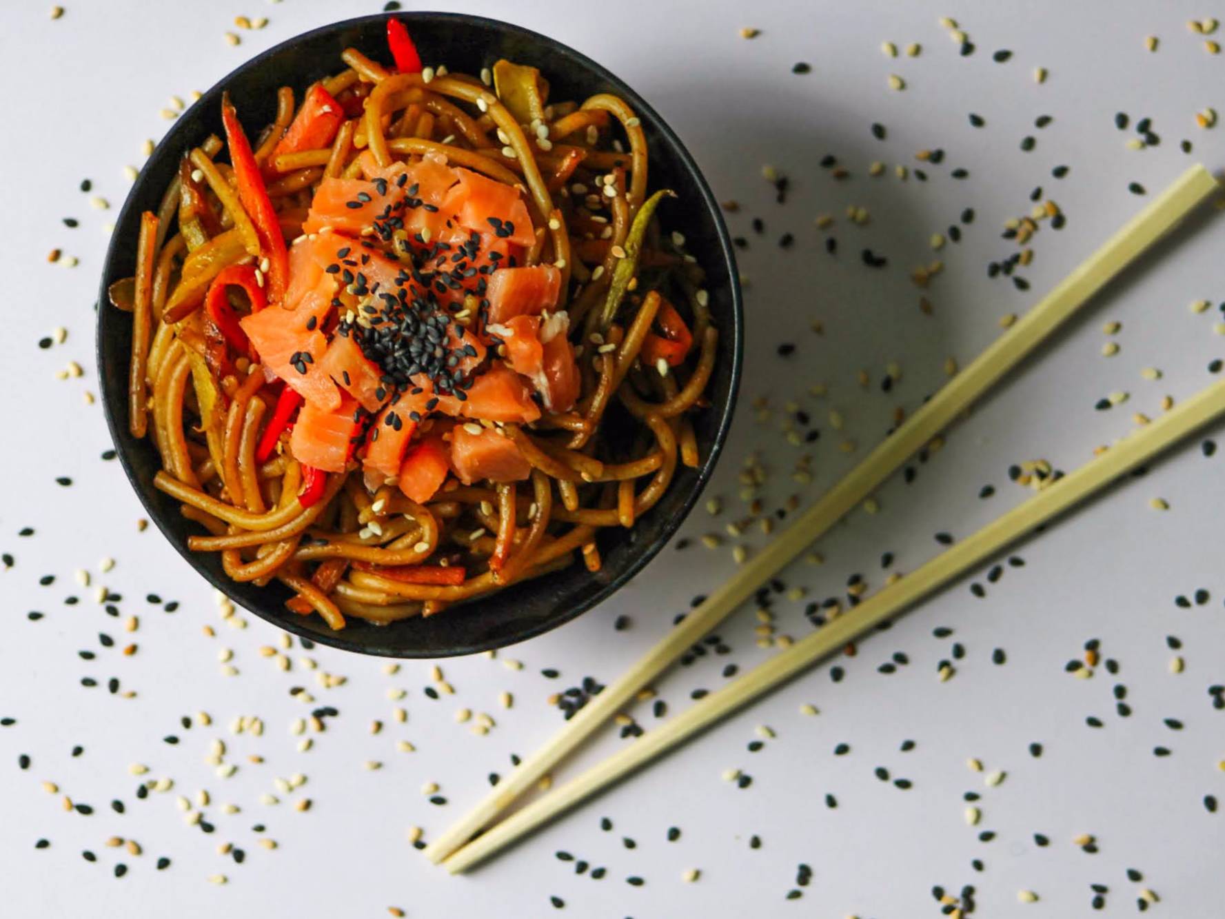 Fideo de arroz con verduras al vapor y tiras de salmón ahumado.