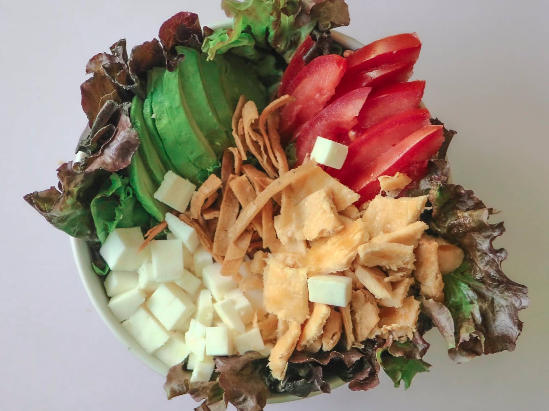 Fresca selección de lechugas acompañadas de láminas de aguacate , jitomates , pollo sazonado , queso panela en cuadritos y fritura de tortilla