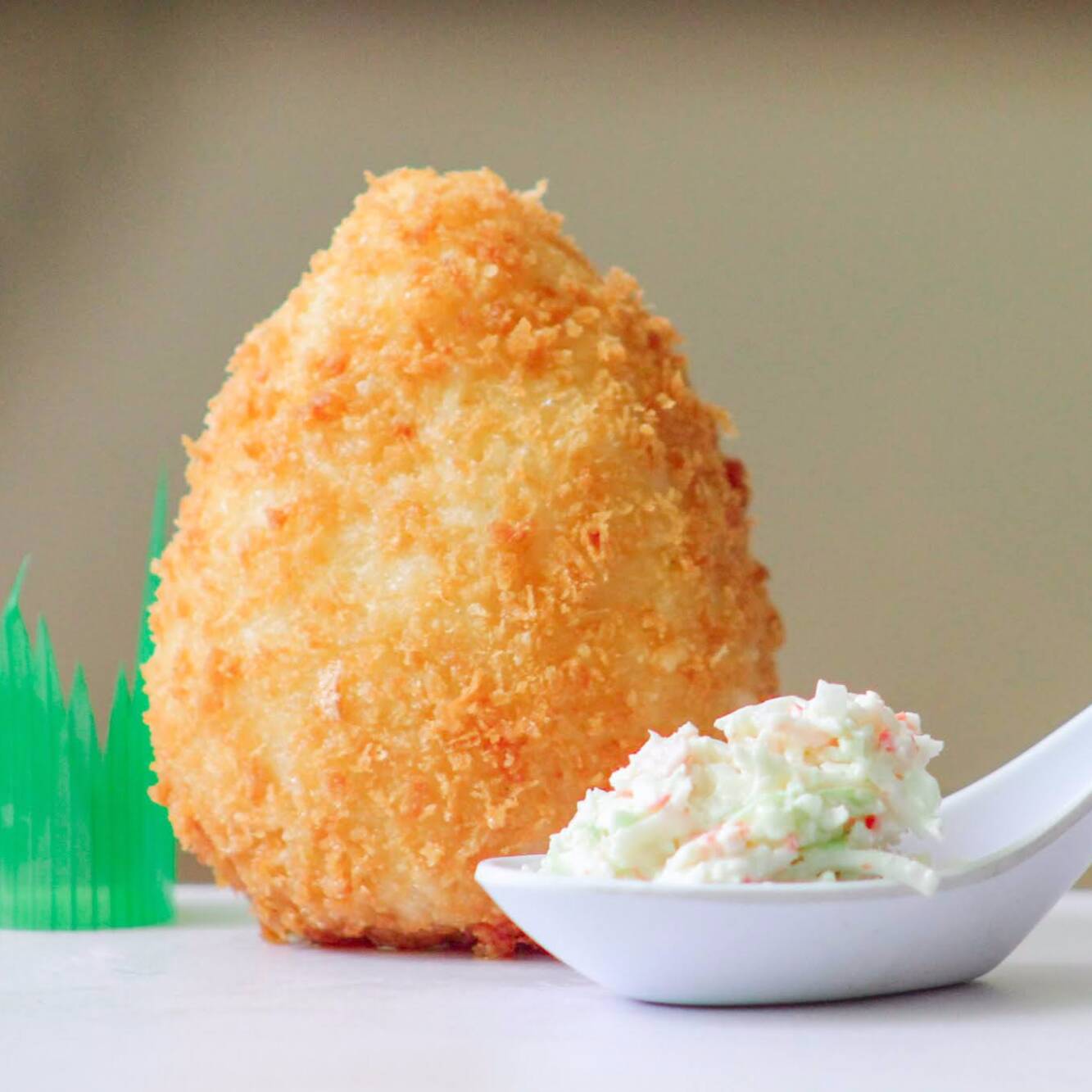 Bola de arroz al vapor Marinada y frita con panko . Rellena de queso crema , surimi y pepino. Acompañada de Salsa Soya .
