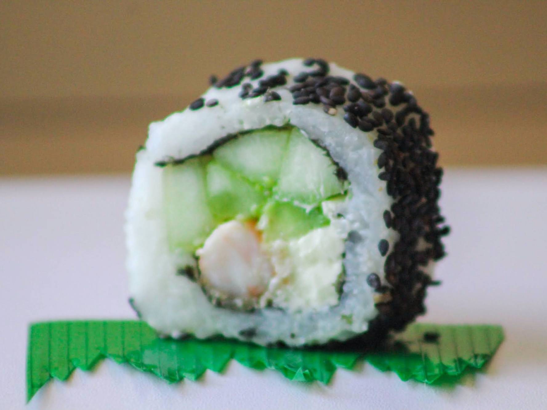 Salmón ahumado, pepino, queso crema por dentro y ajonjolí.