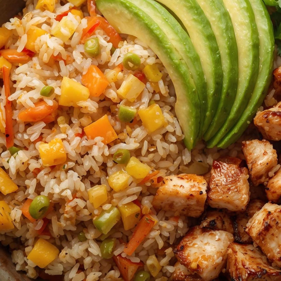 Arroz Gohan frito marinado con soya ; acompañado de fajitas de pollo marinadas y sazonadas , con abanico de aguacate y queso crema.