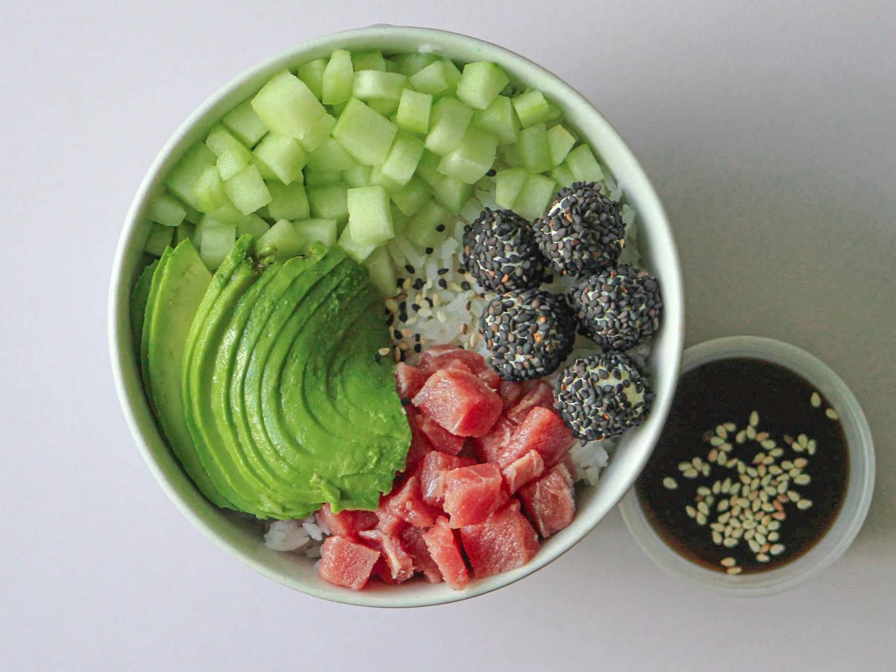 Arroz al vapor marinado con Átun , topping de Pepino , aguacate ,bolitas de queso crema y ajonjolí. Acompañado de salsaSalsa Soya