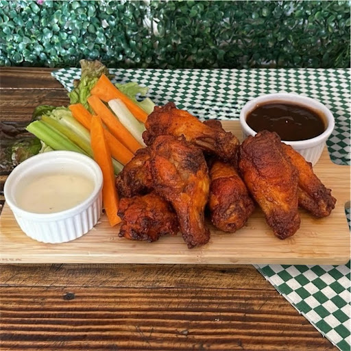 Alitas en salsa BBQ, con guarnición de vegetales y aderezo Ranch