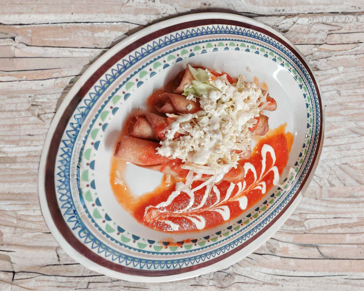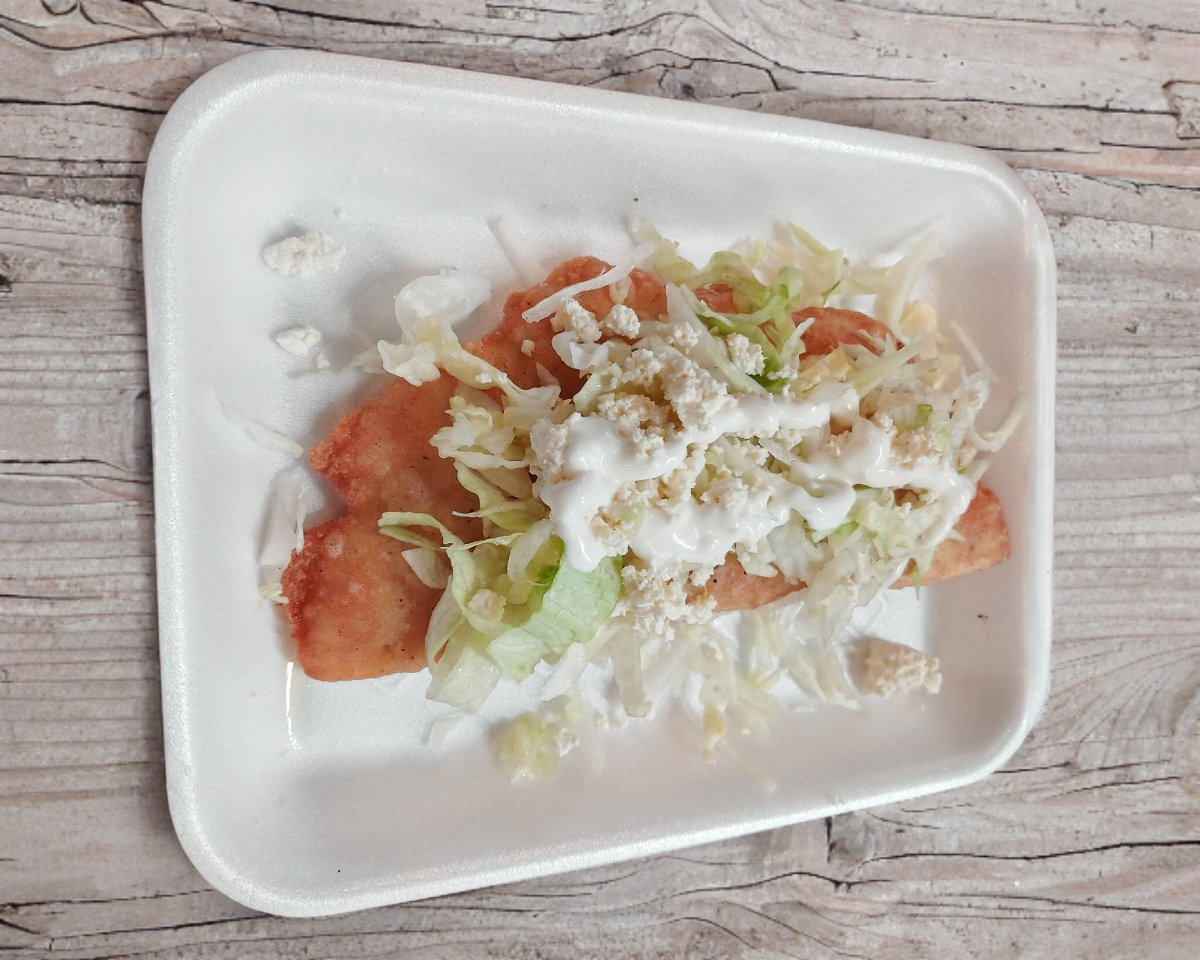 TORTILLA DORADA RELLENA DE LONGANIZA CUBIERTA EN SALSA ROJA, QUESO, MEDIA CREMA Y LECHUGA