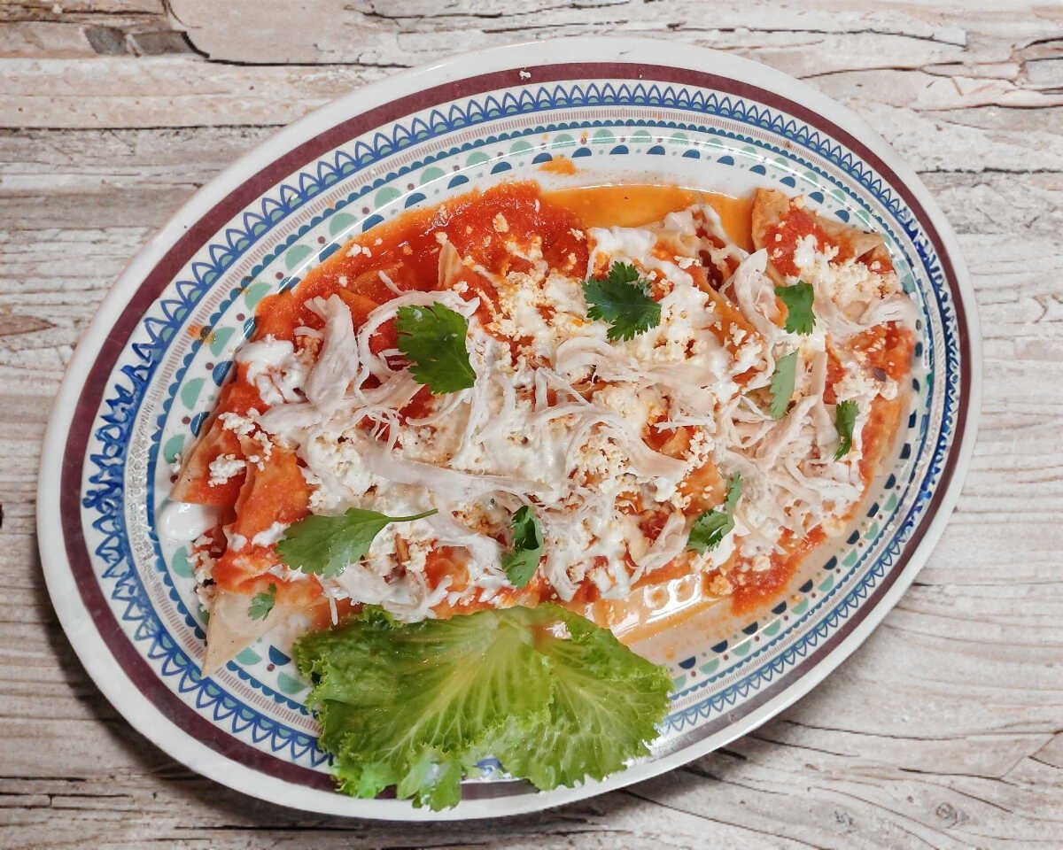 TORTILLA DORADA CUBIERTA EN SALSA ROJA CON POLLO QUESO, MEDIA CREMA