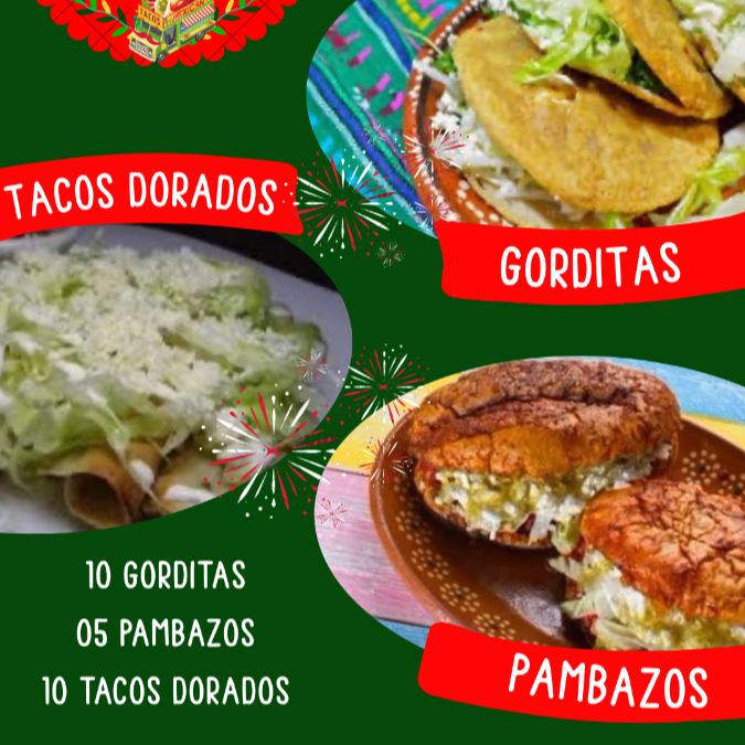 10 GORDITAS, 5 PAMBAZOS Y 10 TACOS DORADOS