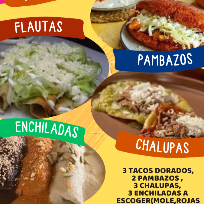 3 TACOS DORADOS, 1 PAMBAZO, 3 CHALUPAS Y 3 ENCHILADAS CON TORILLA A MANO