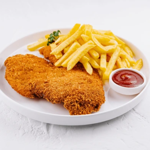 Pechuga empanizada con queso parmesano, incluye ensalada y papas