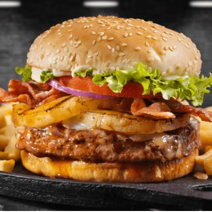 Hamburguesa con piña, tomate, queso incluye papas gajo