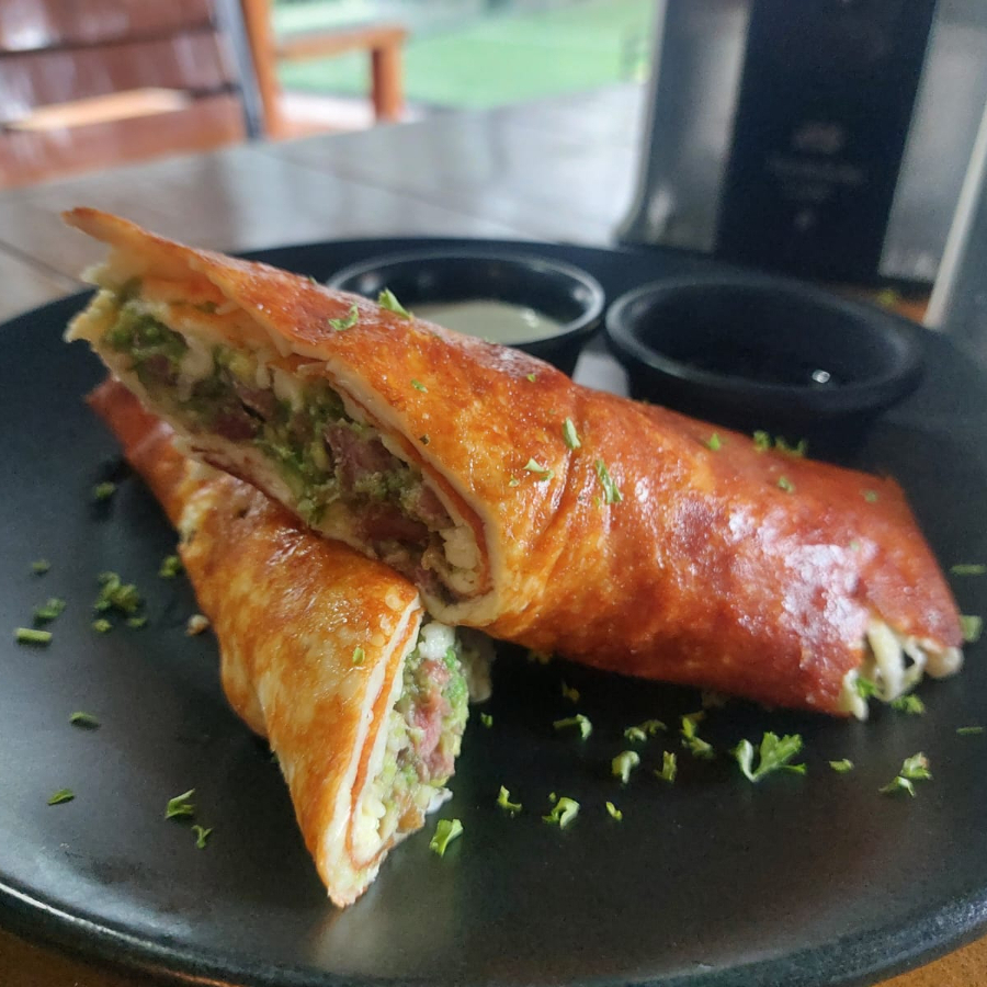 Burrito tradicional de arrachera con aguacate, tomate, cebolla y con una costra de queso que reemplaza la tortilla de harina