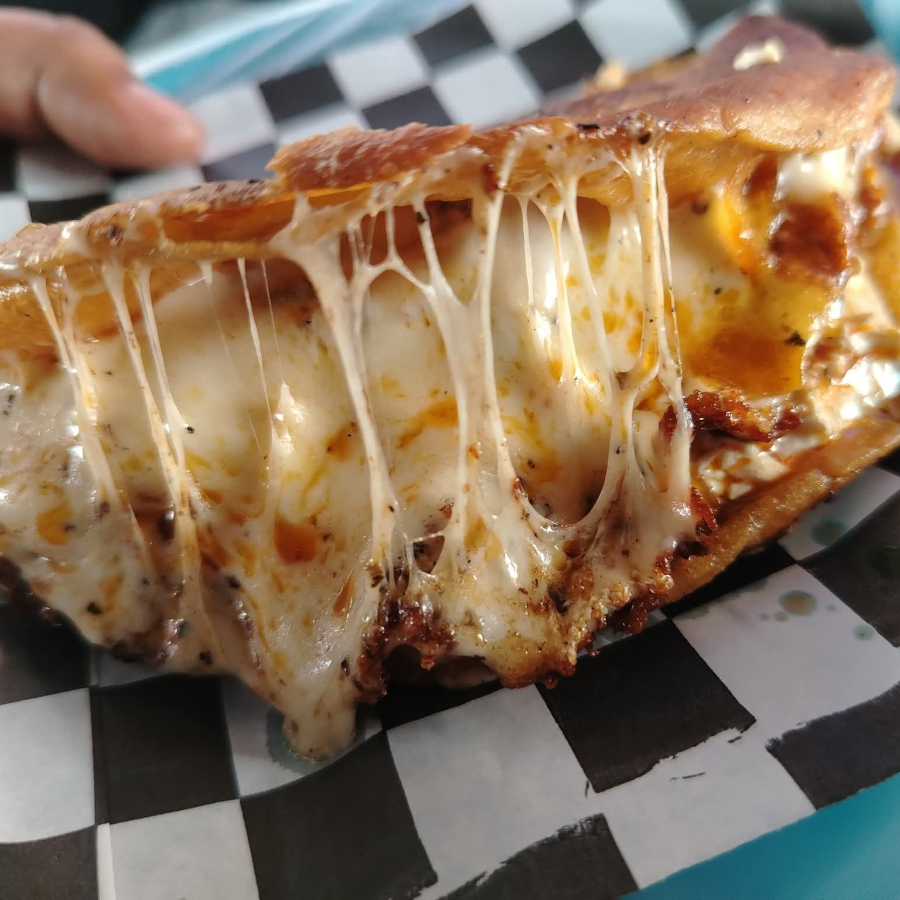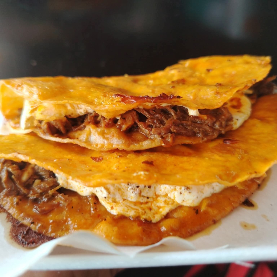 Tortilla de 20 cm con costra de queso, barbacoa y queso de hebra