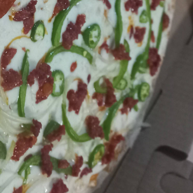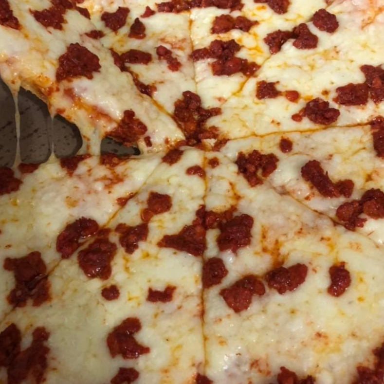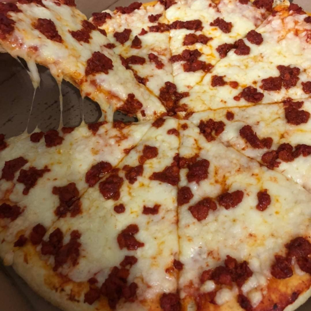 Pizza Grande con una base de queso mozzarella derretido, pimiento, cebolla, chile jalapeño y chorizo. Acompañado de sus aderezos
