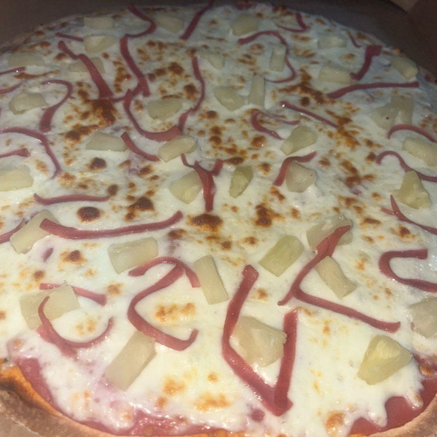 Pizza Grande de base de jamon con Queso mozarella , piña y tiras de jamón