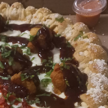 Pizza Grande con una base de queso mozzarella derretido, trozos de philadelphia, cebolla, boneless 100% de pollo bañados en salsa de su preferencia y cilantro, con orilla de dedos de queso philadelphia espolvoreado con queso parmesano.