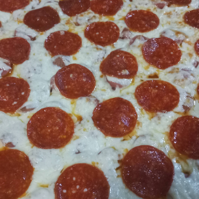 Pizza Grande con una base de jamón , una base de salchicha, queso mozzarella derretido y peperonni con orilla de dedos de queso philadelphia espolvoreado con queso parmesano.
